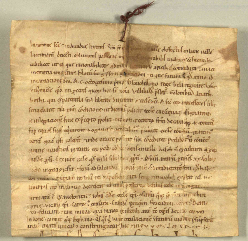 A hártyaoklevél több szempontból is érdekes. Elsősorban formailag, mivel felső részén az – elkallódott – függőpecsét sodratának beakasztására szolgáló bevágások is láthatók (későbbi selyemzsinórral befűzve), a pergamen alsó részén pedig a hitelesítésre használt chirographum A–K betűinek felső fele olvasható. A kirografálásról korábban írtak szerint a legalább két példányban készült adománylevél párja vagy második darabja hitelességét a félbevágott betűk másik példányon lévő, pontosan illeszkedő darabjai biztosították. A függőpecsétes megerősítésre minden bizonnyal egy későbbi időpontban kerülhetett sor.