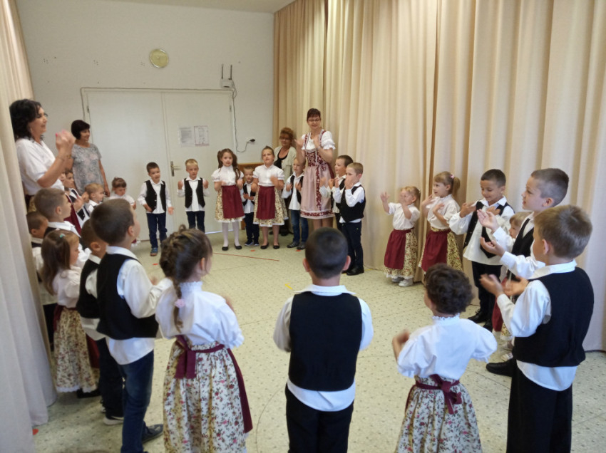 A Napocska csoportos óvodások köszöntő énekeit, verseit követően a német nemzetiségi Holdacska csoportba járó gyerekek táncát, majd az óvoda magyar néptánccsoportjának népi gyermekjátékait tekinthették meg a vendégek.