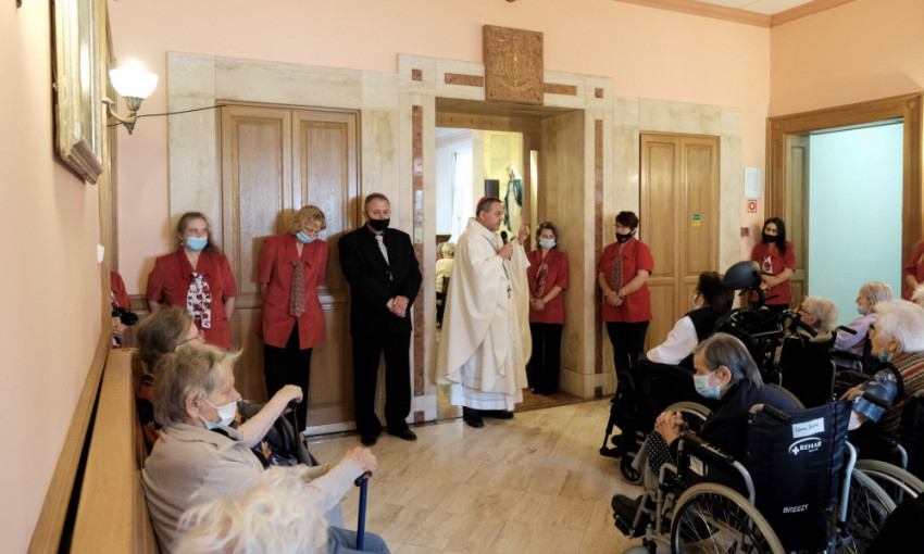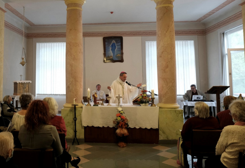 Felföldi László megyéspüspök az otthonban szentmisét is celebrált. Homíliája során, figyelembe véve az idős emberek korlátozott mozgási lehetőségeit, valamint a tér adottságait, az oltár elé kilépve közelebb ment a kerekesszékben ülő gondozottakhoz, hogy számukra is jól hallható legyen a beszéd.