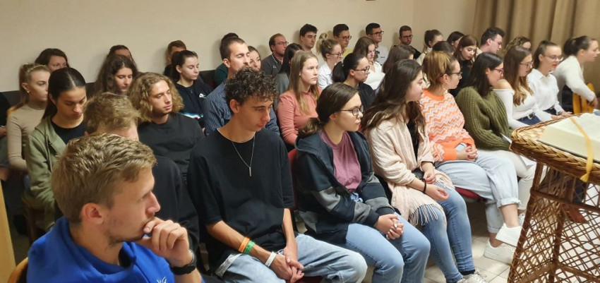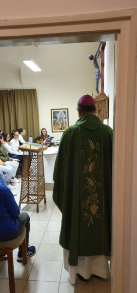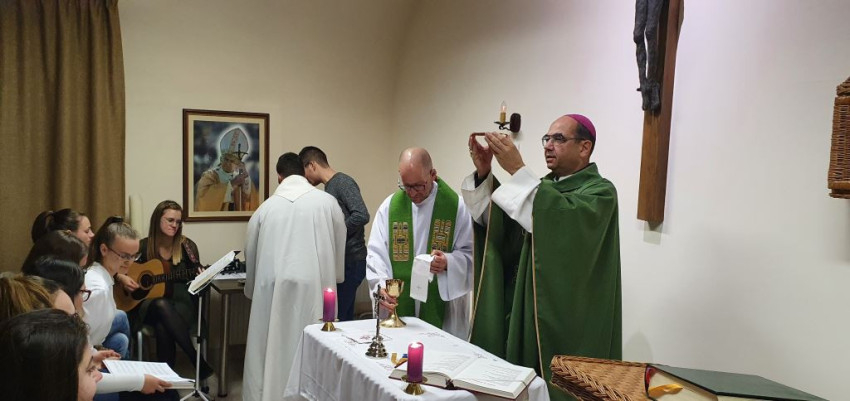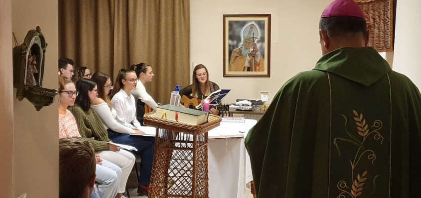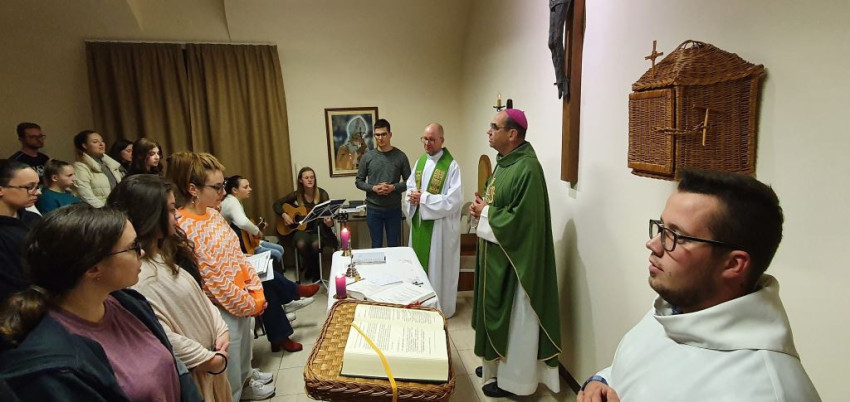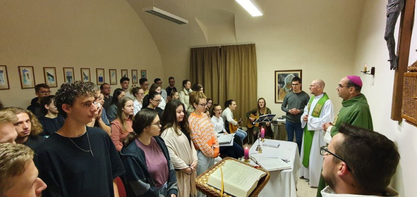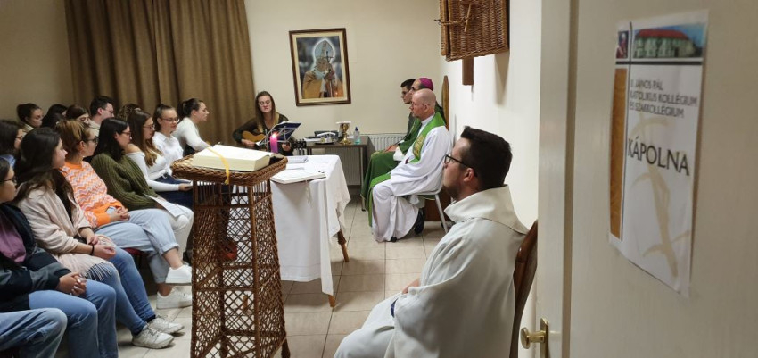 Az egyházmegye főpásztora a tanév során több alkalommal is szentmisét mutat be a szakkollégiumban, amely ezen az estén is megtelt a diákokkal, akik közül többen szolgálattal is – ministrálással, felolvasással, gitáros énekekkel – kapcsolódtak be a liturgiába.