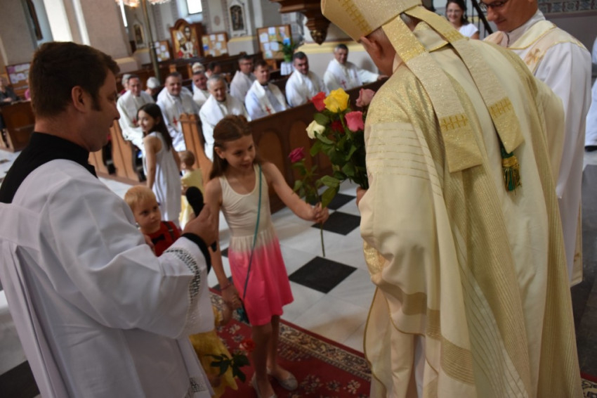 A felajánlási ajándékokat a nagybecskereki édesanyák adták át a főpásztornak, akit Olajos Teodor második osztályos tanuló köszöntött verssel, míg az óvodások és alsós hittanosok egy-egy szolgálati évet jelképező színes rózsákkal gratuláltak.