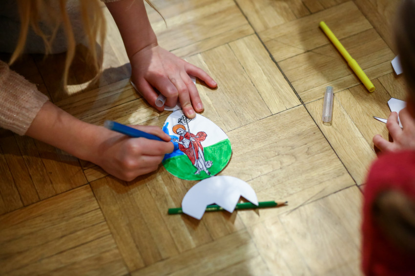 Szinte minden foglalkozás végén van valami kreatív feladat. „Az egyik alkalommal például egy középkori módszert ismerünk meg a gyakorlatban: táblaképre festünk tojástemperával, amit mindenki maga kever ki egy kis kagylóban pigmentporból, tojássárgájából és vízből. Ki lehet próbálni az aranyozást is, ebben egy restaurátor kolléga segít.” A Hős lovagok és elbűvölő hercegnők program végén a fiúk saját címert, a lányok tiarát készítenek, lényegében egy saját attribútumot. „Ezt a programot továbbfejlesztettem csapatépítő, önismereti alkalommá, amit az elsős, az ötödikes és a kilencedikes osztályoknak ajánlok. Az attribútum megalkotásán túl arra a kérdésre is választ keresünk, hogy vajon ki mi lenne, ha tárgy, szín vagy állat volna. A gyerekek ezen a foglalkozáson nemcsak azt tudják meg, hogy miért kötődik Szent Péterhez a kulcs, Szent Pálhoz a kard, és miért van három aranypénz Szent Miklósnál, hanem közben önmagukon is elgondolkodhatnak. A feketeleves akkor jön, amikor a diákokról egy-egy osztálytársuk is elmondja, ő mit gondol róla, szerinte milyen tárgy, szín vagy állat illik hozzá. A foglalkozás végén aztán mindenki készít magának egy címert ezekkel a kiválasztott elemekkel.”