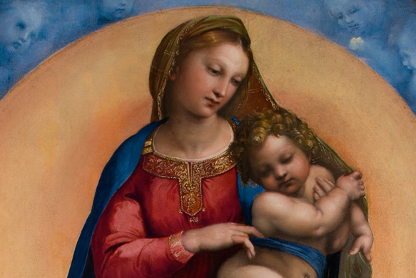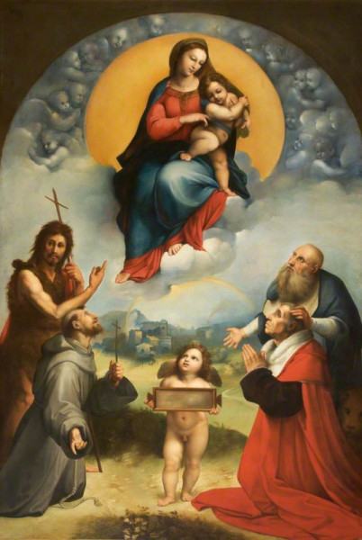 Az eredeti festményt, amely a vatikáni képtárban látható, fatáblára festette az olasz művész 1511-1512-ben. Sigismondo de' Conti, II. Gyula pápa titkára rendelte meg a képet, hálaadásként Szűz Máriának azután, hogy a nemes ember folignói házát villámcsapás érte, mégsem okozott benne kárt.