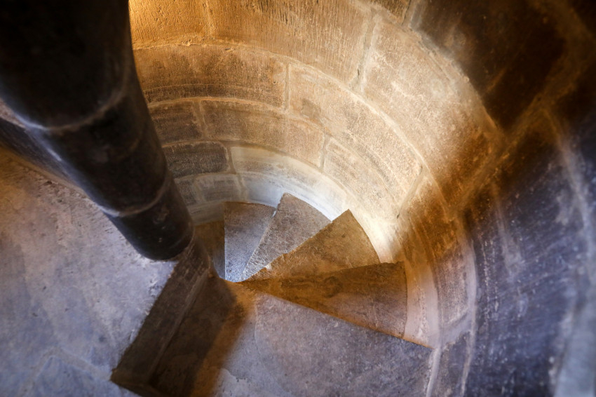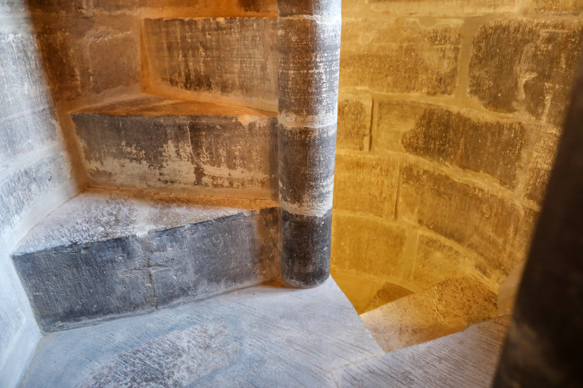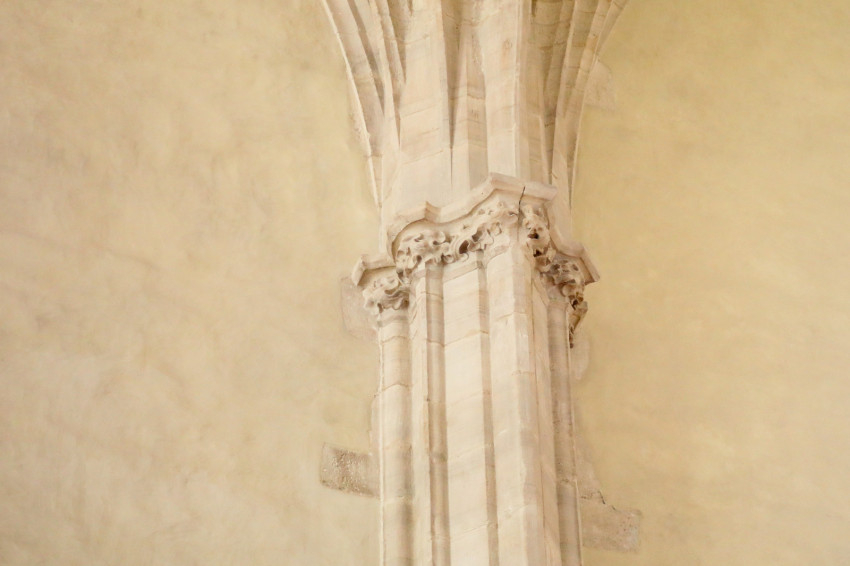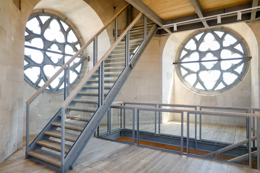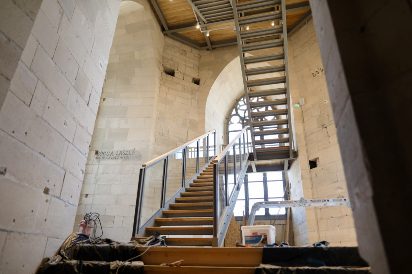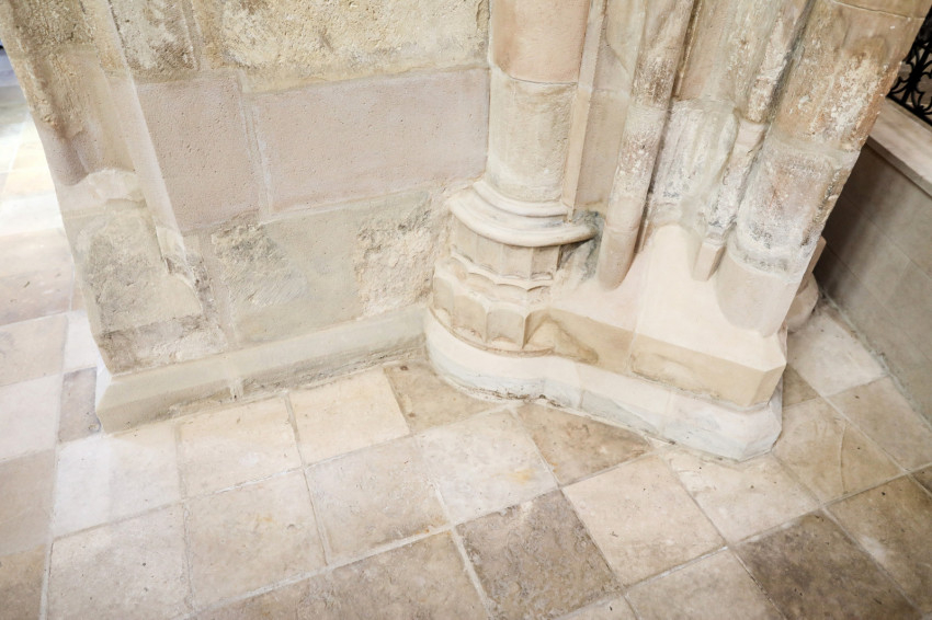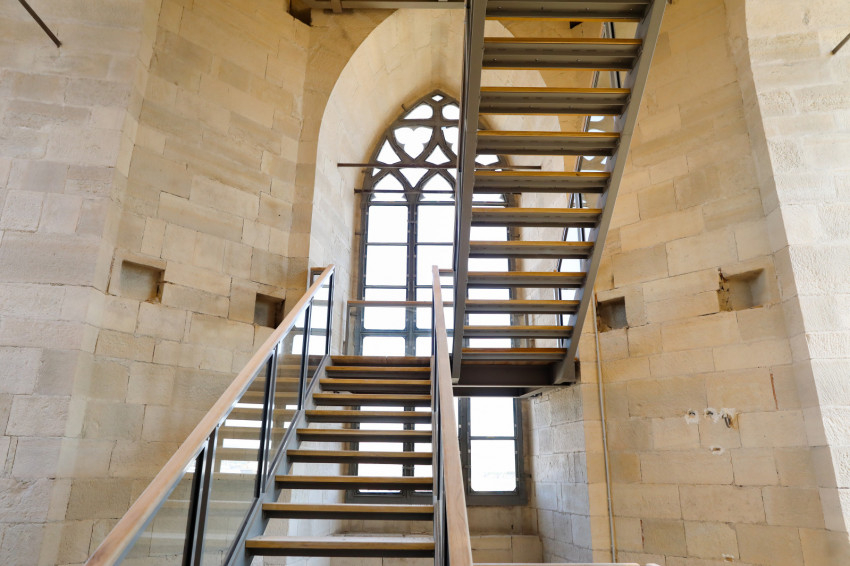Az a döntés született, hogy lépcsőket helyeznek el itt, amelyek levezetnek a kápolnához. Így a templom eredeti járószintjén is járhatunk, illetve megcsodálhatjuk a gondos kezek által helyreállított korábbi pillérek díszes lábazatát. A kápolna falainak vastagságából arra lehet következtetni, hogy annak idején itt tornyot szerettek volna építeni, ami azonban sosem készült el.