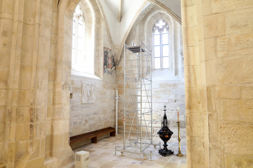 Az első meglepetés a jobb kéz felől nyíló Schleuning-kápolnánál ér. A korábban inkább raktárra emlékeztető, részben eltakart kápolnánál egy magas, éppen bontás alatt álló létraépítmény jelzi, hogy csak nemrég fejeződött be a restaurálás. Amikor a mesteremberek megbontották a járófelületet, és valamivel több mint egy méter mélyre leástak, rátaláltak a pillérek díszes lábazatára.