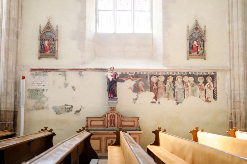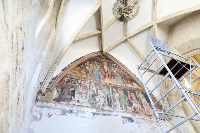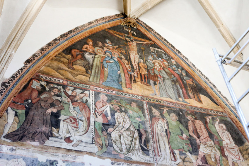 A kápolnában található, Jézus szenvedéstörténetét és az ítélkező Krisztust ábrázoló középkori freskó is eredeti színeiben pompázik.