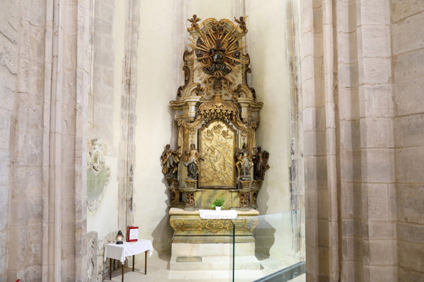 A kommunizmus viharos éveiben elbontották, és darabjait a Schleuning-kápolnában helyezték el, ahol rejtve maradhatott, de a feledés várt rá. A felújítás során aztán az egykori oltárt átszállították a plébánia területére. Amikor László Attila rátalált, és megismerte a történetét, egyértelmű volt számára, hogy ennek az oltárnak méltó helyen kell állnia – később született a döntés, hogy e hely éppen a Szent Mihály-templom új liturgikus tere lesz. Az oltárkőben a korábbi szentek ereklyéi mellett kialakítottak egy helyet, hogy ha majd megtörténik Márton Áron boldoggá avatása, könnyen elhelyezhető legyen itt az új ereklye. A szentélyben találhatjuk a szent életű erdélyi püspökhöz köthető katedrát, amelyet püspökké szentelésekor és később is használt.