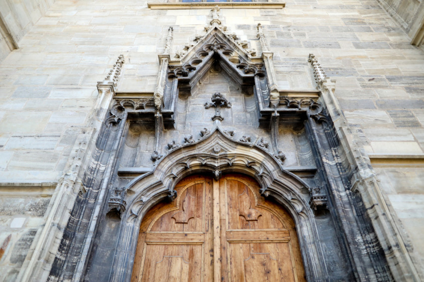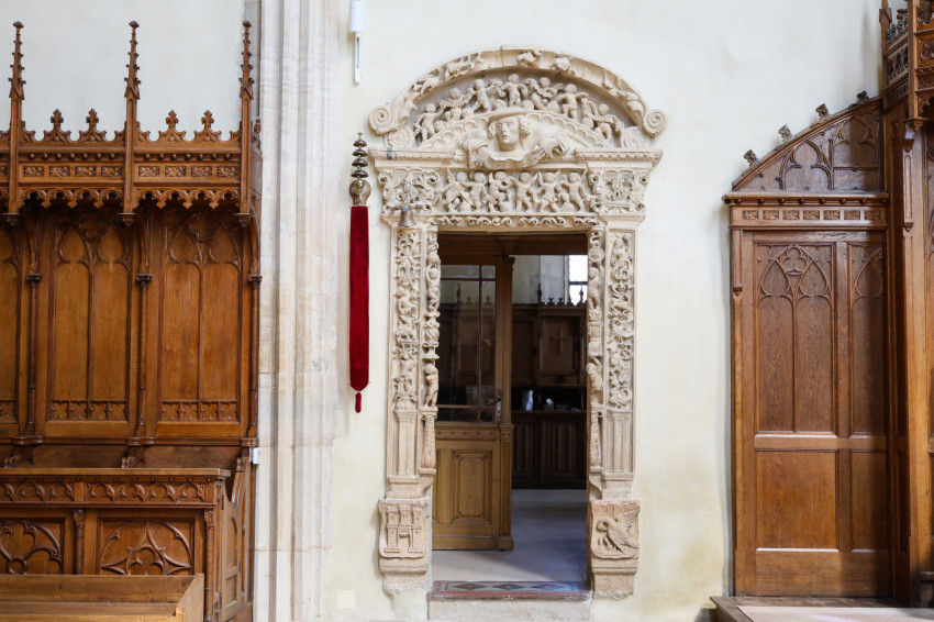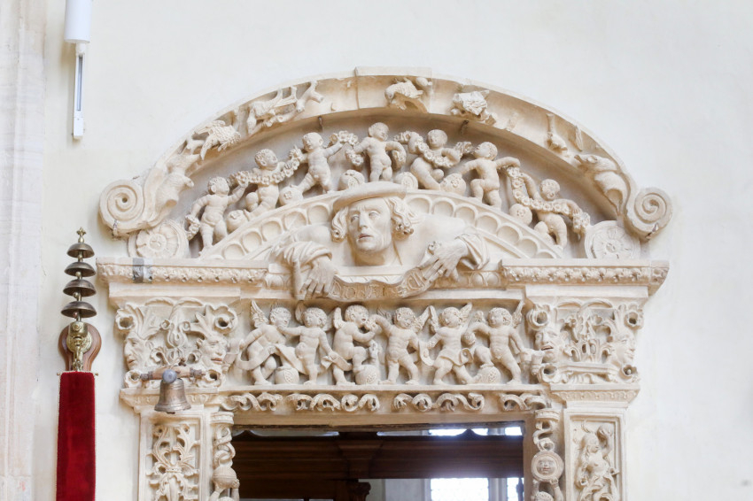 A reneszánsz ajtókeretet 1528-ban készítette Johannes Klein plébános, akinek nemcsak nevét, hanem arcát is megőrizte a remekbe szabott alkotás.