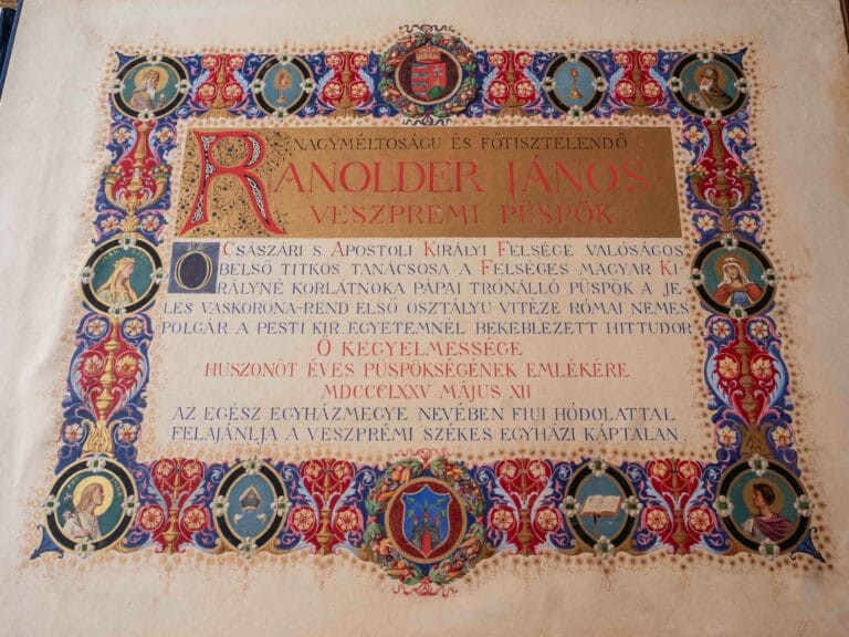 E nagy formátumú főpap tiszteletére készült jubileumi album Budapesten, Morzsányi József díszműkészítő műhelyében. A reneszánsz stílusú művet a legkiválóbb művészek munkái díszítik. A festményeket Rauscher Lajos, Székely Bertalan, Keleti Gusztáv készítették. A fémmunkák ifj. Lehmann Gyula és Ausim Ede szaktudását dicsérik. A címoldalon olvasható ajánlás után a püspök portréját csodálhatjuk meg, majd részletes életrajza következik. A kéziratos album következő oldalán a káptalan tagjait a barokk székesegyházzal és a püspöki palotával ábrázoló képben gyönyörködhetünk. Az Árnyas liget, koszorus lombos erdő kezdetű dicsőítő himnusz zengi el Ranolder püspök számtalan jótéteményét. A következő festmény Ranoldert mint a Ferenc József Alapítvány létrehozóját mutatja be. Majd hét kép következik a nőnevelés céljára építtetett nagyszerű épületekről. Az albumot a Fényben ragyog az Úr oltára kezdetű üdvözlő költemény zárja le.