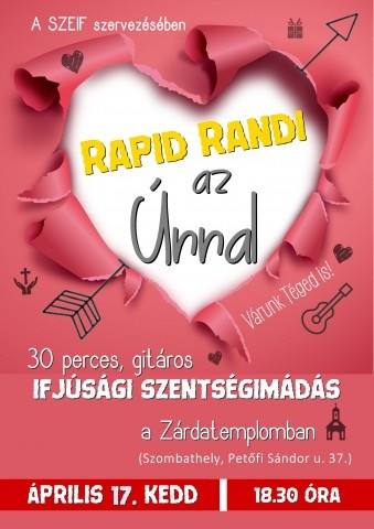 A Szily János Értékőrző Ifjúsági Fórum a továbbiakban is megrendezi a gitáros énekekkel és rövid elmélkedésekkel kísért szentségimádást. A következő Rapid Randi az Úrral április 17-én, kedden lesz a 18 órakor kezdődő szentmise után, 18.30 órától.