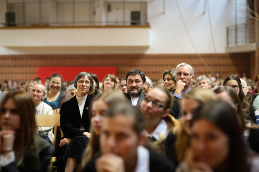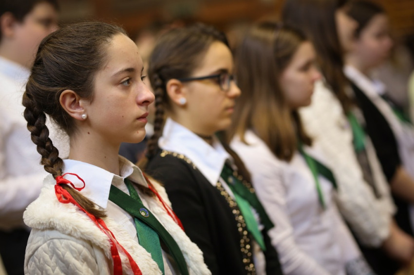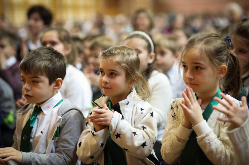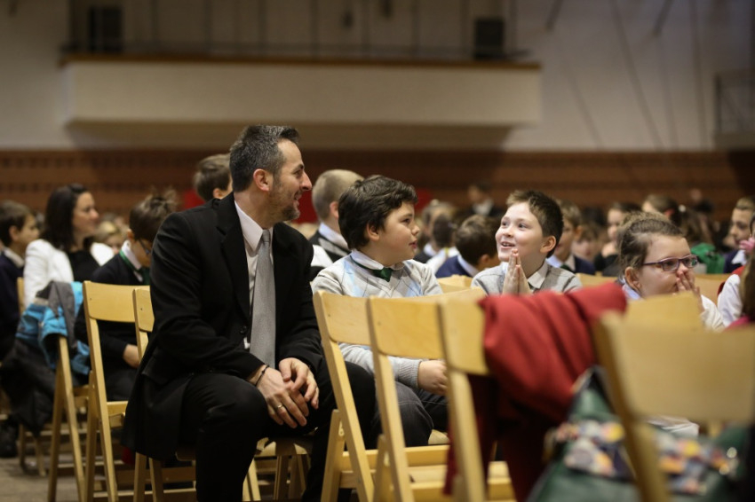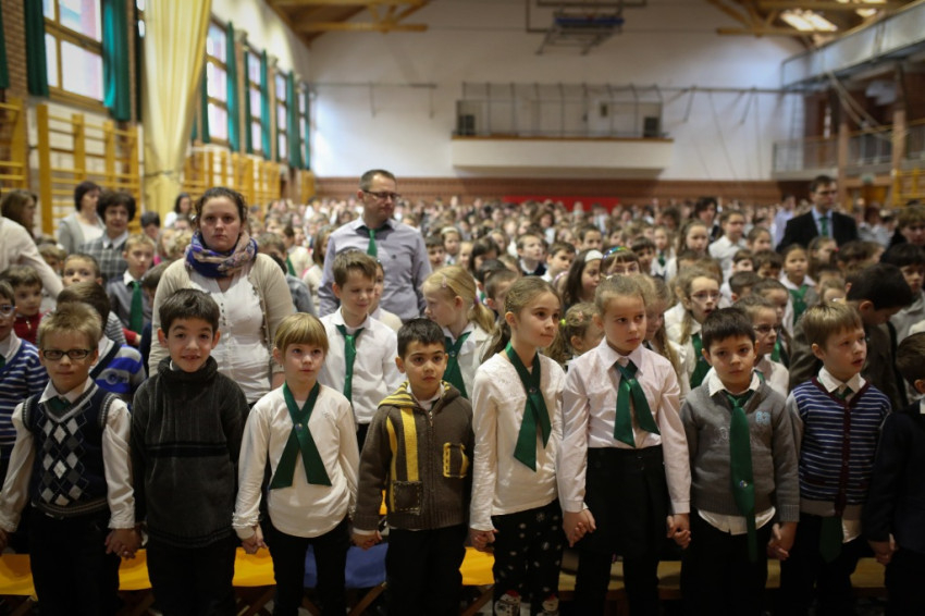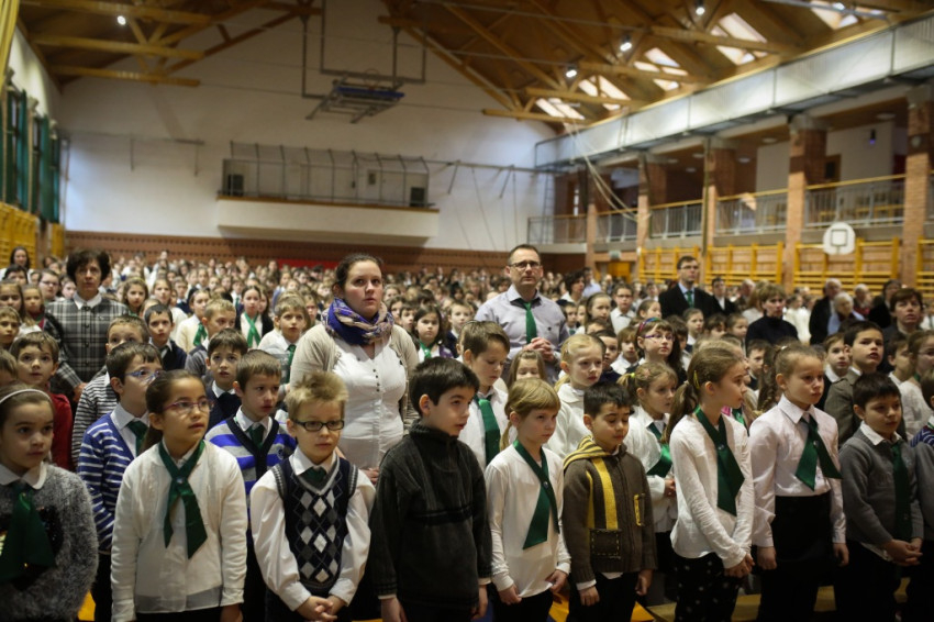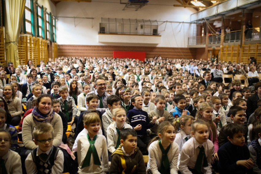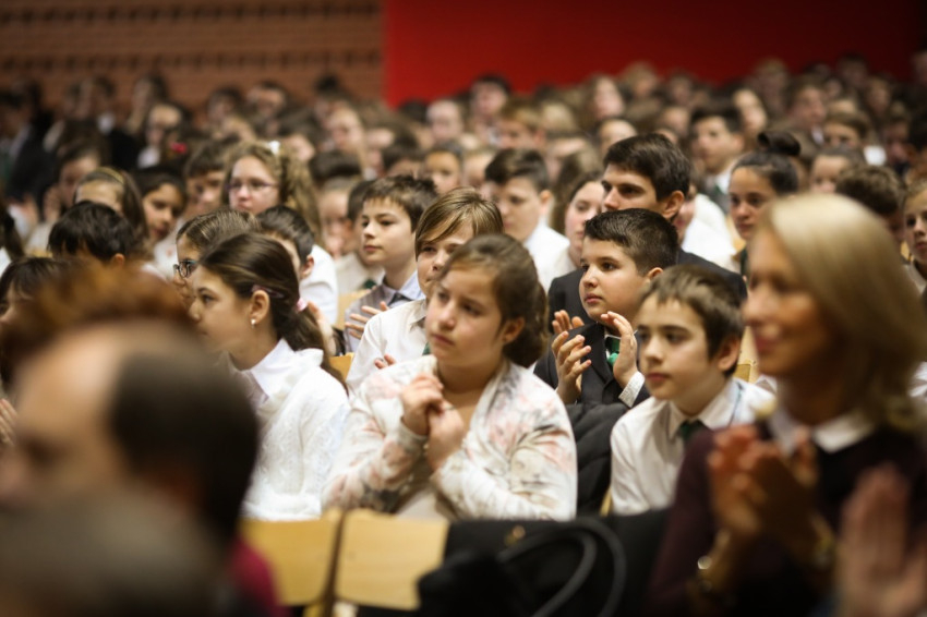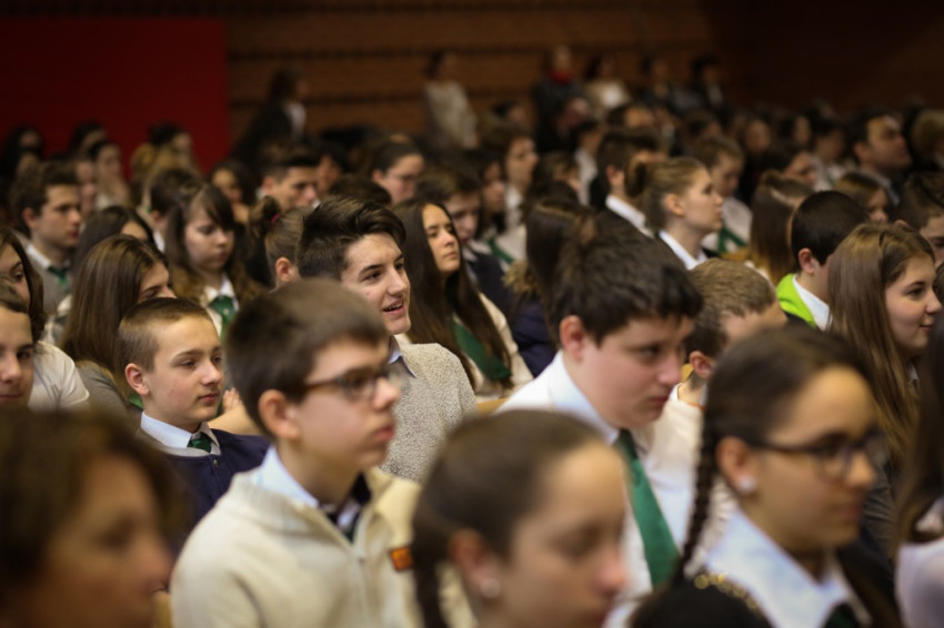 Soltész Miklós, egyházi, nemzetiségi és civil társadalmi kapcsolatokért felelős államtitkár a dísztermet megtöltő gyerekközösséghez Edmondo De Amicis A kőművesinas című elbeszélésének tolmácsolásával szólt, a nevelőknek pedig a katolikus iskola küldetéséről beszélt. Ma mintegy 120.000 gyerek tanul katolikus intézményben – mutatott rá a rendszerváltozás óta eltelt 25 év óriási gyarapodására. A katolikus iskola a tananyag közvetítése mellett a közösségépítés helye. Ez nem mérhető számokban, de hozzájárulása életünkhöz annál fontosabb – mutatott rá az államtitkár, és köszönetet mondott ezért az erőfeszítésért a nevelőknek.