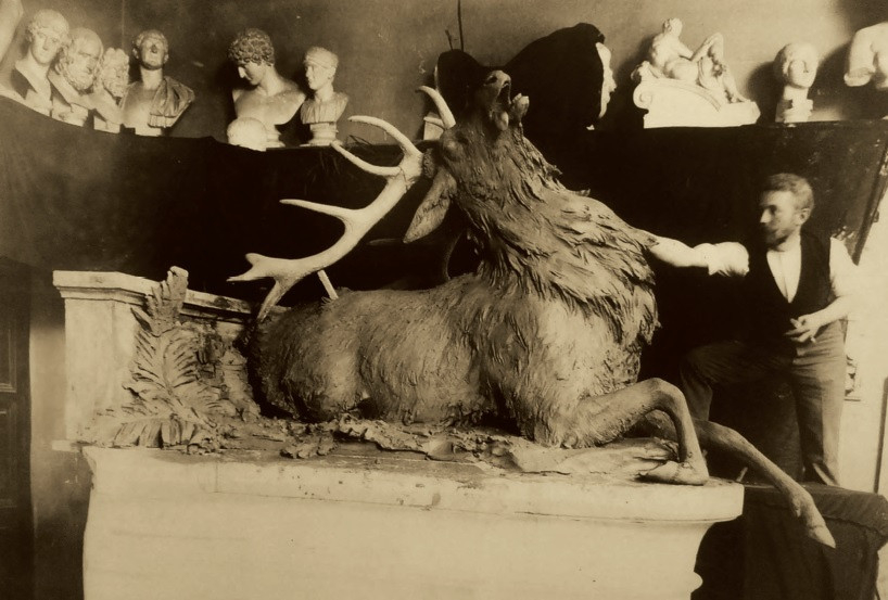 Egy másik fényképen egy haldokló szarvas szobra készül éppen: az alkotást gróf Esterházy Miklós József rendelte meg a tatai kertjébe, a Mátyás-kúthoz. A szobor mellett feltehetően a készítőjét, Apáti Abt Sándort láthatjuk.