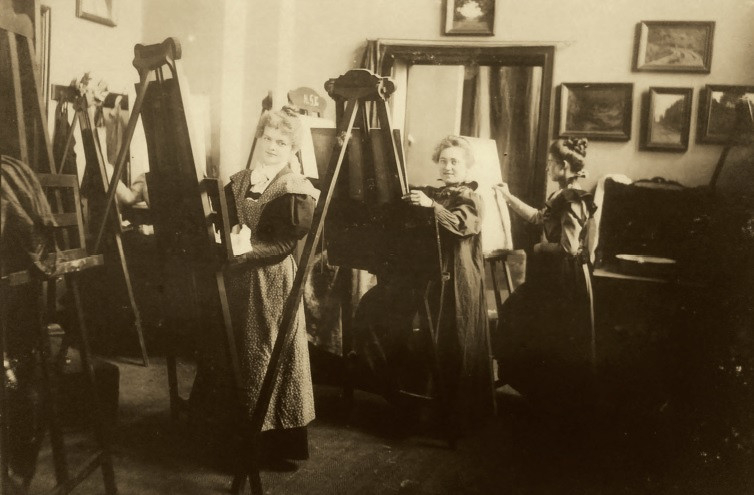 Remek képek maradtak fenn a gyűjteményben a Magyar Királyi Női Festőiskola növendékeiről is; a felvételek munka közben ábrázolják a fiatal művészeket. A különféle átszervezések miatt az intézmény hol önálló iskolaként, hol pedig az akkori képzőművészeti főiskola, a már említett Mintarajztanoda részeként működött. Szívmelengető érzés nézni ezeket a kor divatjának megfelelő frizurát és ruhát viselő fiatal lányokat, asszonyokat, amint díszes festőállványaik mellett dolgoznak.
