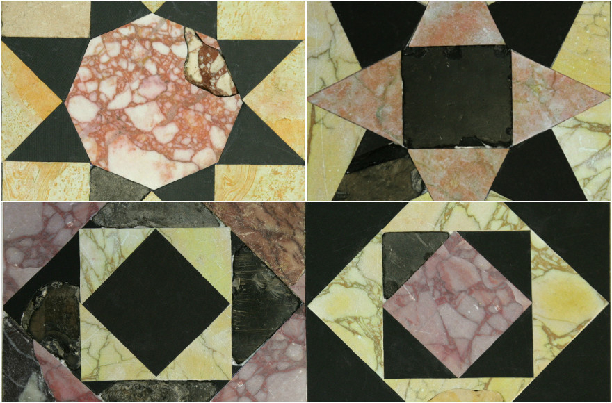 A mozaikpadlót különböző színű, más-más területekről származó kövekből rakták ki, színes geometrikus mintázatokat formáltak a kis kődarabokból. A kézzel faragott kövek alapanyaga a jeruzsálemi hegyekből származó világos mészkő és a Holt-tenger környékén fejtett sötét színű kövek, valamint az Égei-tenger vidékéről importált márvány volt.