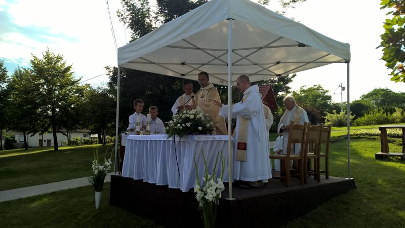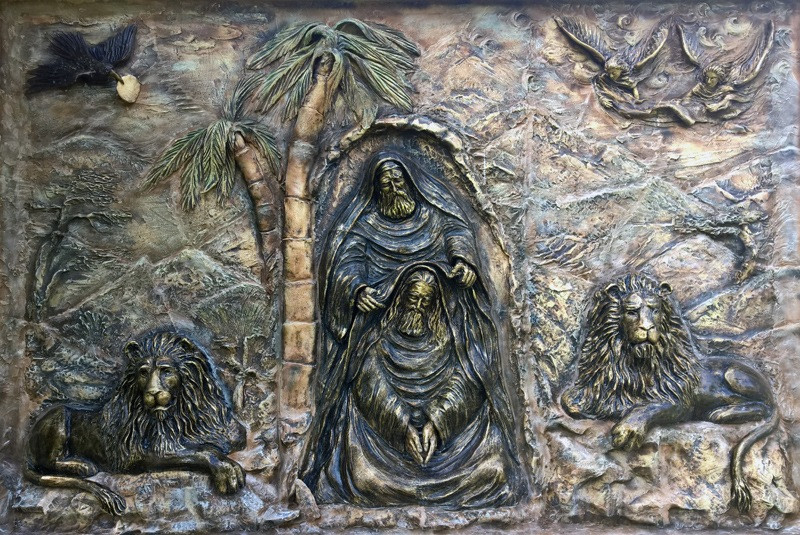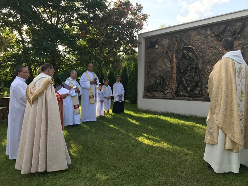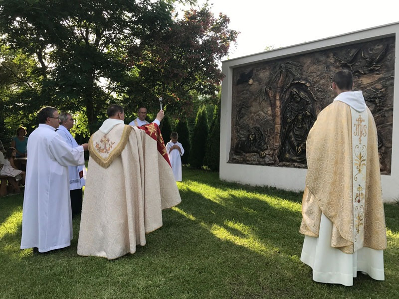 A szentmise után Borsos József márianosztrai pálos szerzetes megáldotta Varga Gábor szobrászművész alkotását, a Remete Szent Pált és Remete Szent Antalt ábrázoló domborművet. Az alkotás azt a jelenetet ábrázolja Remete Szent Pál életéből, amikor Szent Antal – miután kérésére elhozta Pálnak Szent Atanáz köpenyét – visszaérkezve holtan találja meg őt. Pál imádsága közben hazatért Teremtőjéhez. A domborműn látható pálmafa, a holló, csőrében cipóval és az oroszlánok Remete Szent Pál attribútumai, melyek a pálos rend címerében is megtalálhatók.