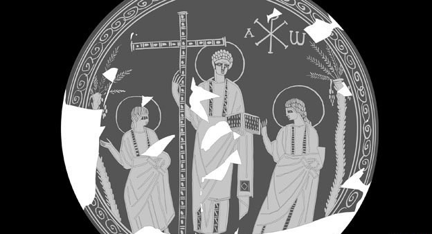 A kép közepén áll a Megváltó, jobb kezében egy kereszttel, a másikban pedig az evangéliumokat tartja. Feje fölött egy monogramos kereszt, a Chí-Ró (Khí-Ró; Chi-Rho) látható. Jézus oldalán két, tógát viselő apostol áll, minden bizonnyal Péter és Pál, kezükben egy-egy tekerccsel. Mellettük datolyapálmák (a kora keresztény ikonográfiában a halhatatlanság szimbólumai) magasodnak.