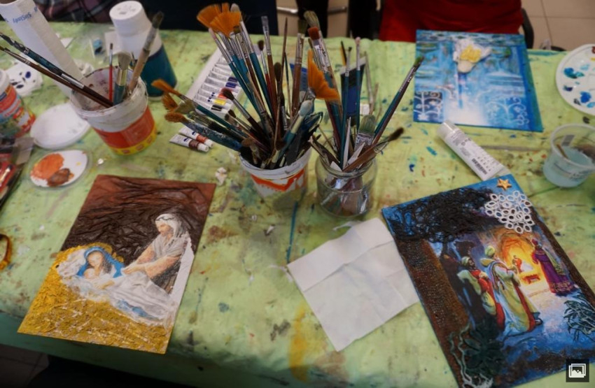 Lángh Ildikó, a csoport művészeti vezetője – miközben minden alkotónak fogja a kezét, azaz hasznos tanácsokat vagy konkrét technikai segítséget is ad az esetleges elakadásoknál – ismerteti csapatuk tevékenységét és különlegességét is. A Magyar Máltai Szeretetszolgálat győri önkéntes csoportjának tagjaiból már nyolc éve alakult meg e művészeti kör azok számára, akik érdeklődést mutatnak a művészeti tevékenység iránt. A csoporttagok és az évek alatt hozzájuk csatlakozó művészetkedvelők nem csak akkor találkoznak, amikor önkéntes munkát végeznek. Eddigi kiállításaikkal azt bizonyítják, hogy az önkéntes tevékenység hatékonyabban végezhető, ha van egy olyan csoport, amelynek a tagjai jól ismerik egymást és közös élmények sora fűzi össze őket. A közös alkotás lelki nyugalmat ad, tovább erősíti a közösséghez tartozást, vagy akár a testi gyógyulásban is nagy szerepet kap. Ugyanakkor a társaság az egyén művészetét is segíti, minden elkészült darab tükrözi készítőjének személyiségét. A mostani foglalkozáson a szorgos munkálkodás mellett már saját karácsonyi ajándéknak szánt festmény alaprajza is felvillan a művészeti vezető ipadjén, ami egy új művészeti technika elsajátítását is előrevetíti. Izgatottan várják, hogyan aranyozzák majd az elkészítendő angyalt, hogy aztán ők maguk is angyalként adják tovább az ajándéknak szánt festményt szeretteiknek, bearanyozva az ünnepeket.