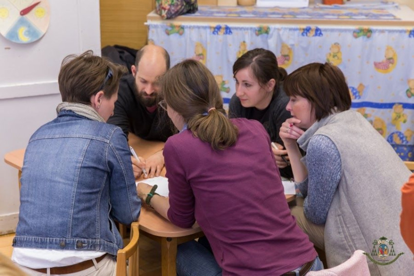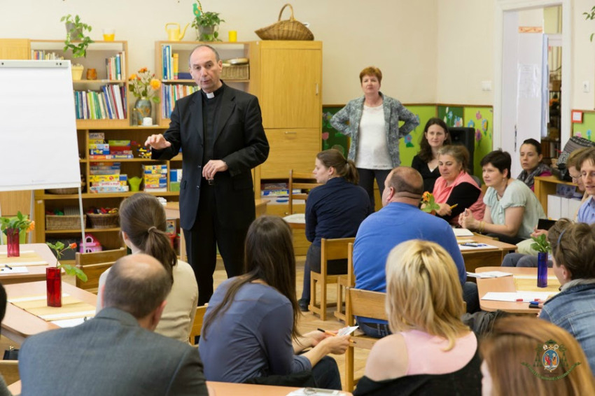 Az előadásra Tomposné Kovács Edit óvodavezető meghívta a jelenleg az intézménybe járó és a következő nevelési évtől felvételt nyert gyermekek szüleit is. A szülők aktívan bekapcsolódtak az ismerkedést követő csoportmunkába, amely során a főpásztor kérésére összegyűjtötték a gyermekek nevelésénél a későbbi életkorokban is fontosnak tartott értékeket. Arról gondolkodtak közösen, milyennek szeretnék nevelni gyermekeiket, milyen tulajdonságok a legfontosabbak számukra. Udvardy György az összegyűjtött értékek mentén folytatta előadását, kiemelve a szülők tudatos felelősségvállalását a gyermeknevelésben és a hitben való elmélyedésben, növekedésben.