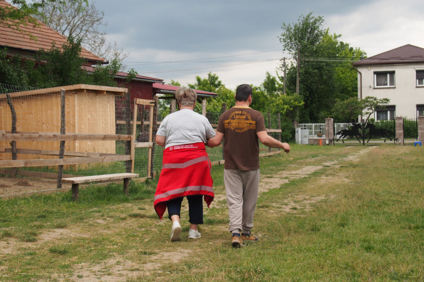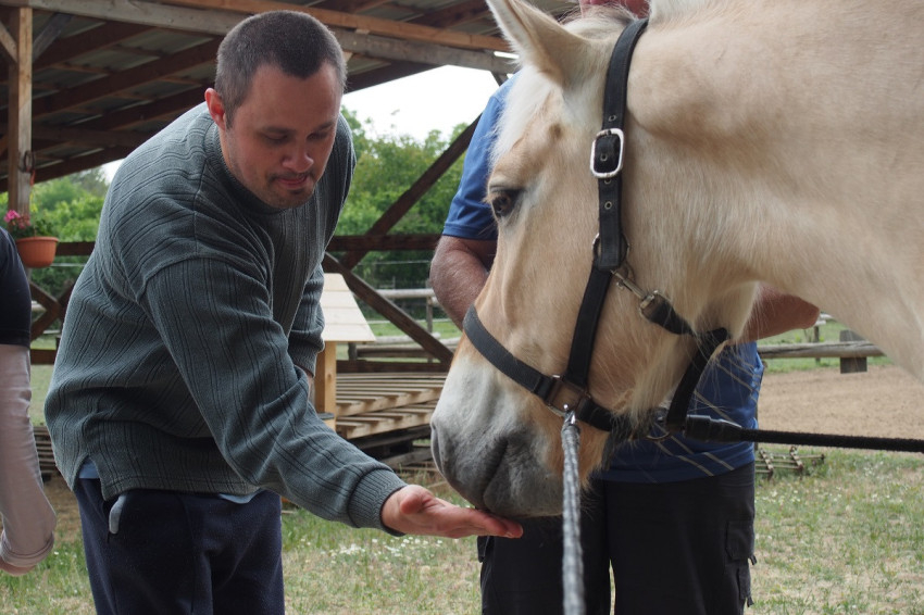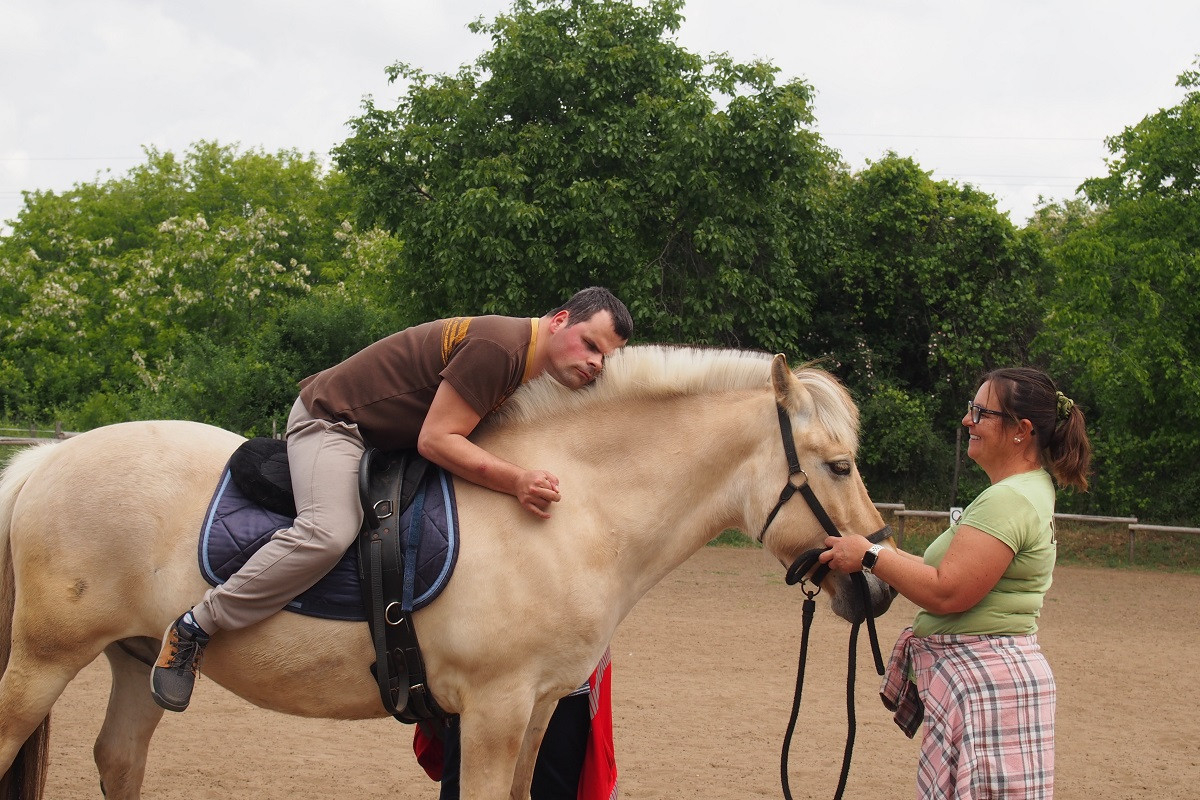 Örömteli társaság érkezett, három fiatal gondozott, akik nem először jártak itt. Nánai Norbi visszahúzódó alkat, mesélik róla, hogy először nehezen szánta rá magát, de most már bátran felül a nyeregbe, és egy kis bizonytalanság után szemmel láthatóan egyre vidámabb, egyre komfortosabban érzi magát a magasban. Gondozója, Sajti Tünde úgy látja, hogy azóta a társaival való kapcsolatban is nagyobb az önbizalma.
