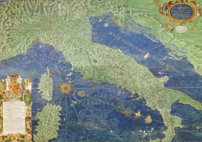 A térképfestő műhely megalkotta az itáliai régiók és a nagyobb városok freskóit. Ez utóbbiakat madártávlatból, hasonlóan a mai légi felvételekhez. A régiók városai címereikkel jelennek meg, védőszentjük kíséretében és történetük egy-egy jellemző momentumával. Milánó védőszentje, Szent Ambrus Lombardia térségében. Mantova várostérképe mellett Nagy Szent Leó pápát látjuk, amint 452-ben a hun ostrom elhárítására Attila követeivel tárgyal. Apulia, a mai Puglia tartomány felső részét Gargano hegye fölött Szent Mihály főangyal védelmezi. A hegyes-dombos Abruzzo régió nagyvárosa Aquila, a vele északon határos Marche tartomány, az egykori Picenium Macerata ábrázolása a tengeri kikötős Ancona, a Szent Házat birtokló Loreto és Ascoli Piceno városokat is bemutatja, természetesen térképeikkel együtt. Az 1582-es politikai állapotok jórészt ma is érvényesek, és azt is mutatják, hogy az itáliai félsziget egyetlen egység. A térképgalériában láthatjuk még Venezia, Friuli, Trentino, Alto-Adige, Lombardia, a Nápoly környéki Campania, Calabria, Szicília, Siracusa, Messina térségét nagyobb városaikkal együtt. A szigetek is megjelennek Szicília mellett: Szardínia, Elba, Málta, Korfu. A térképsorozat nyitódarabja fölött latin írás olvasható: „Italia totius orbis regio nobilissima”, vagyis Gergely pápa értelmezése szerint: Itália a földkerekség legnemesebb területe. A nobilis latin szó itt egyszerre jelenti a szépséget, a változatosságot; a művészetet, a kultúrát és a történelmet.