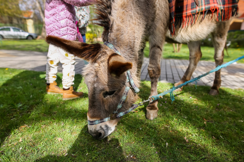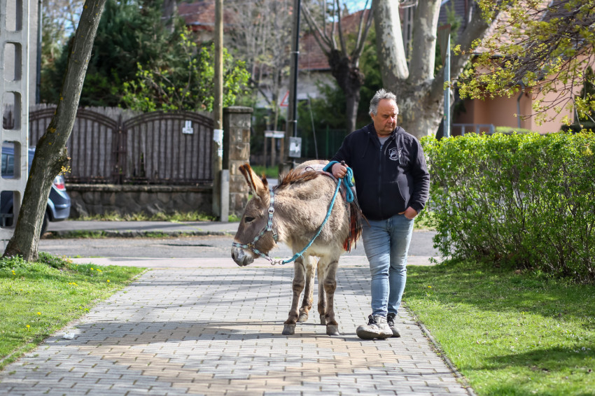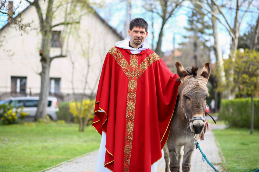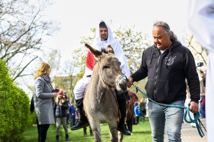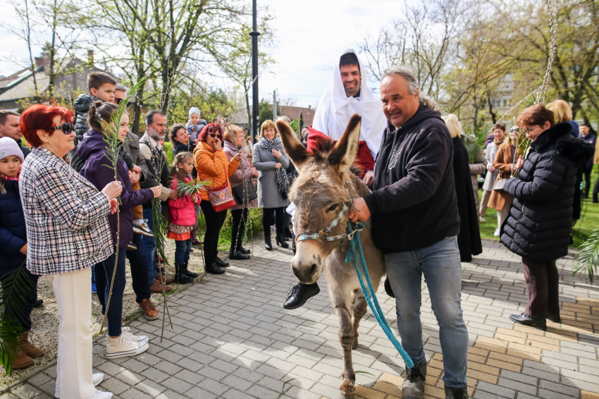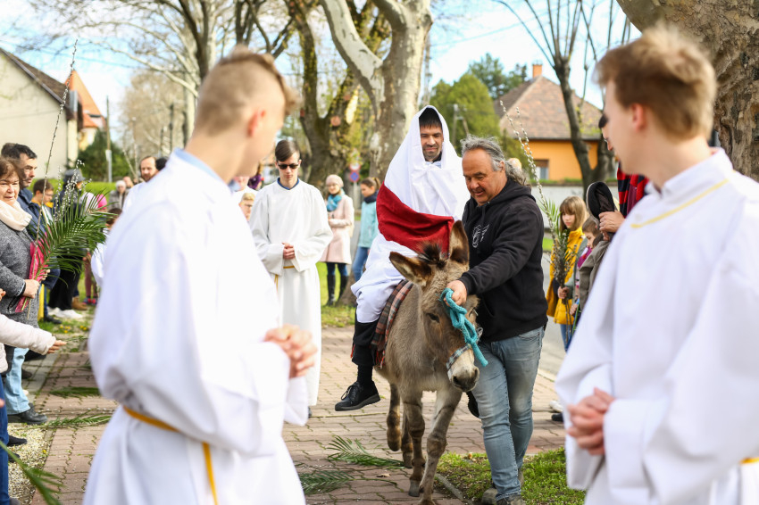 A park végében a legelésző állatokhoz érve Jézus kérte tanítványait, hozzák el számára a szamarat. Erre ráterítették ruháikat, Jézus pedig felült rá (egy kis segítséggel, hiszen nem mindennapos gyakorlat hosszú fehér papi ruhában szamárhátra pattanni). „Kicsiny szamáron jön közénk, aki világot alkotá” – hangzott az egyik ének, miközben a szamárháton ülő Jézus és a ministránsok méltóságteljesen megkerülték a templom előtti teret. A csacsi és Jézus pillanatok alatt összehangolódtak.