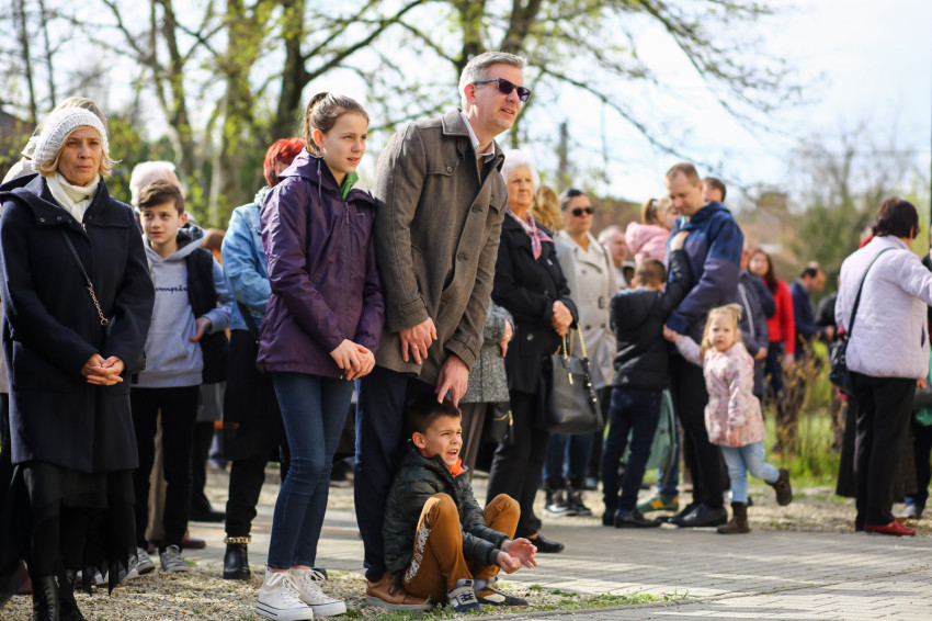 A körmeneti kereszt előtt hódolatukat fejezték ki a gyerekek és a hívek, majd bevonultak a templomba a szentmise megünneplésére.