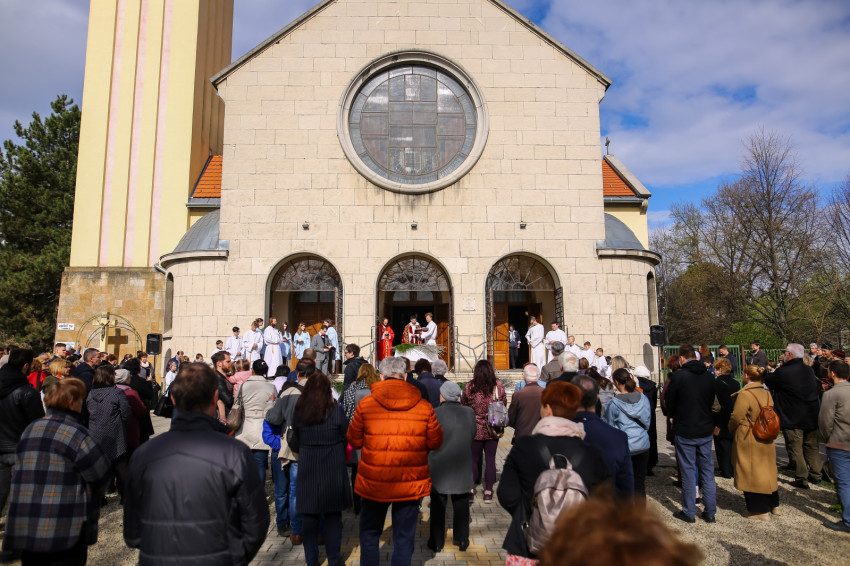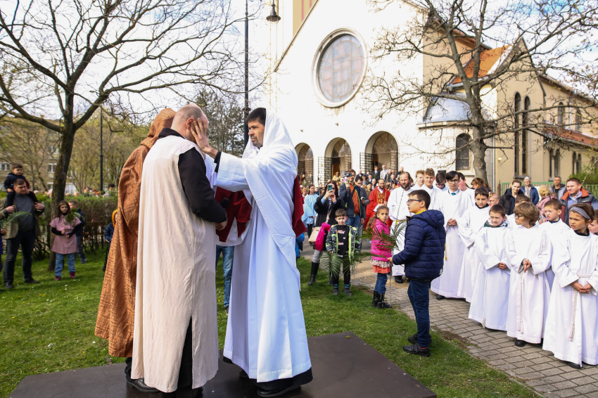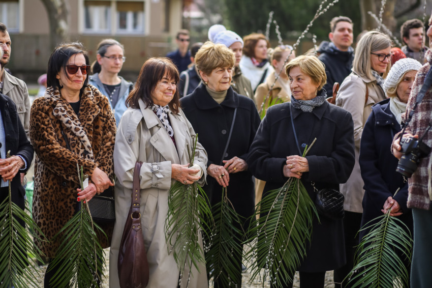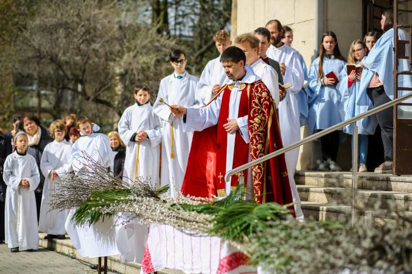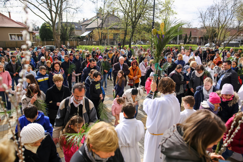 Ő ugyanis ezt a misztériumot akarta beteljesíteni, amikor felment városába, Jeruzsálembe. Szívünk élő hitével és odaadásával emlékezzünk meg erről az üdvösségszerző bevonulásáról. Lépjünk mi is az Úr nyomába, hogy amint kegyelemből társai vagyunk a kereszthordozásban, ugyanúgy feltámadásának, örök életének is részesei lehessünk” – kezdte a szertartást Horváth István, majd megáldotta a barka- és pálmaágakat, miközben a szkóla énekelte: „Jeruzsálem gyermeknépe pálmafáknak ágait hozván elébe ment az Úrnak. S kiáltotta hangos szóval: Hozsanna a magasságban!”