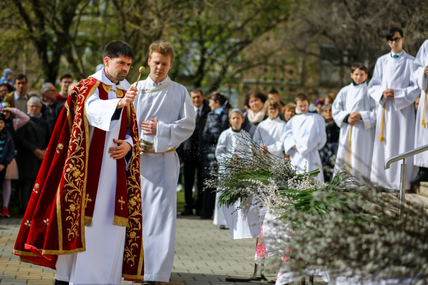 „Hozsanna Dávid fiának, áldott, aki az Úr nevében jő, Izraelnek királya!” – énekelte Őri Gergely kántor, miközben a ministránsok és a tizenéves lányokból álló szkóla elfoglalták a helyüket a pálmaágak és a barkák megáldására.