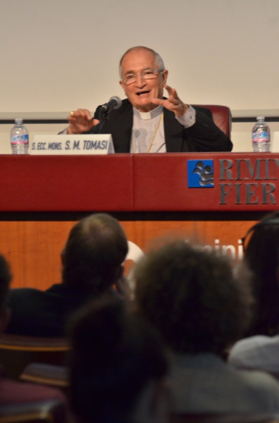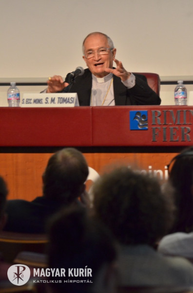 A vészhelyzet a világban: a nemzetközi szervezetek feladata téma kapcsán Silvano Maria Tomasi érsek, az ENSZ állandó szentszéki megfigyelője elmondta: „A nemzetközi erőknek több felelősséget kellene adni, hogy minden békés eszközzel meg lehessen védeni a kiszolgáltatott emberek jogait. A menekültek száma soha nem volt ilyen magas a második világháború óta, ezért nagyon reálisnak kell lenni. Európa nem tudja befogadni azt a sok millió embert, aki ide akar jönni. A megoldás útja a lehetséges legátfogóbb befogadás mellett a megelőzés, azaz segíteni a fejlődést a saját országukban. Még fontosabb politikai megoldást találni az erőszak megfékezésére, amely a migráció elsődleges oka. Mindennek megtételéhez irgalomra van szükség.”