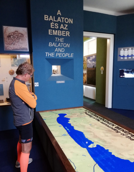 A következő teremben meg is érkeztünk az egyik legkényesebb témához, amely A Balaton és az ember címet viseli. A fali ábrán egy pisilő kisfiút láthatunk, de ez most nem azonos a brüsszeli híres kis szobrocskával. Az alatta lévő szövegben olvasható, mire utal a pisilő kisfiú képe: „A tóba közvetlenül jutó szerves anyag a veszélyes algásodást segíti elő. Ma már tudjuk, hogy a tó környezete felszíni és éghajlati adottságainak eredménye, tehát nem volt öröktől fogva, és – utódaink legnagyobb bánatára – nem is fog örökké létezni. Azt is tudjuk, hogy már soha nem lesz olyan, mint volt a rómaiak vagy akár Széchenyi István korában, mert az elmúlt két évszázadban az ember oly mértékben belenyúlt a Balaton életébe, hogy a tó sorsát immár a természet és az ember közösen alakítják. Az előbbi tényezők változása ma még kiszámíthatatlan, sajnos, időnként az emberi beavatkozás hatásai is. Minél jobban megismerjük a Balaton tulajdonságait és minél inkább korlátozni tudjuk a tó kihasználására irányuló napi érdekeinket, annál többet tehetünk a Balaton életének meghosszabbítására.”