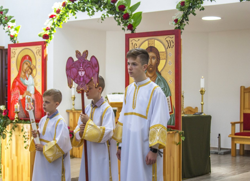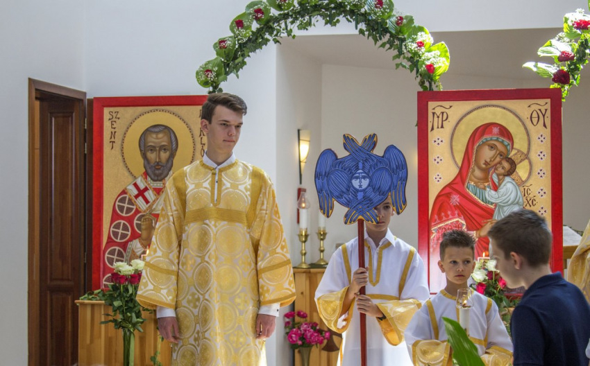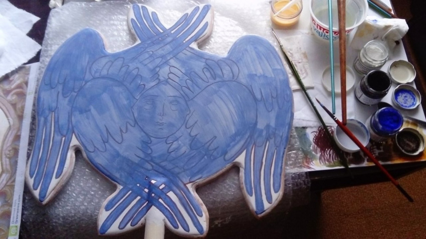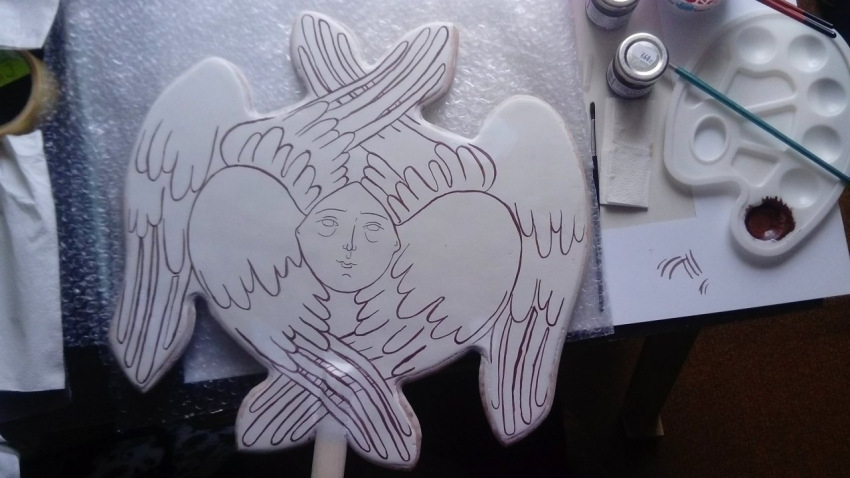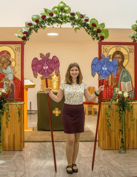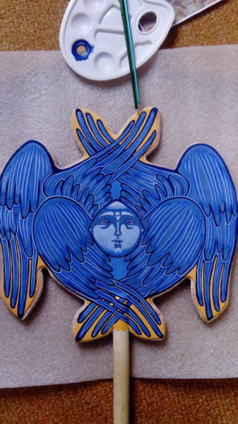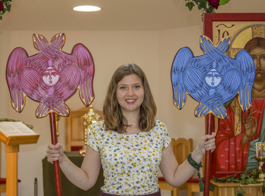 – Az első dolog, ami fejtörést okozott, hogy technikailag a kivágott faformát és a hordozó nyelet hogyan illesszük össze. Következő lépés a faanyag enyves-krétás előkészítése volt, majd a festés következett – tradicionális ikonfestészeti eljárással: enyvezéses-kréta alapozással és tojástempera-technikával. A színeket Tamás atyával közös megegyezés alapján választottuk ki, így lett a szeráf piros színű, a kerub pedig kék.