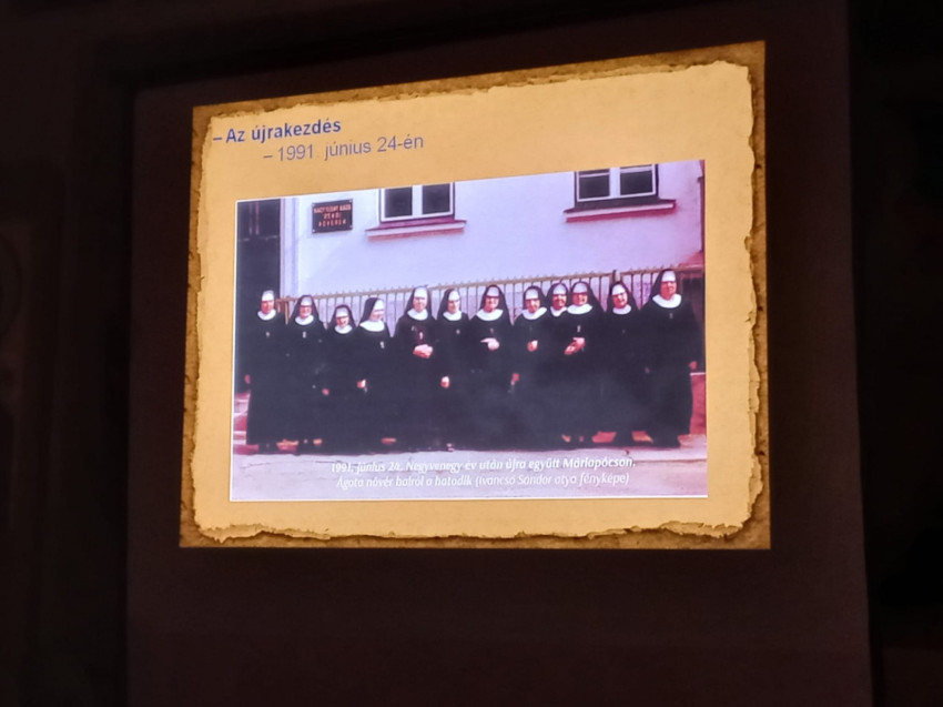 Hála Istennek, többüknek sikerült sekrestyésként, kántorként „templomközelben”, egyházi szolgálatban maradnia – tette hozzá az előadó. – 1991-ben kezdhették újra életüket tizenketten a máriapócsi „visszavásárolt” rendházban, és folytathatták korábbi áldásos tevékenységeiket: lelkigyakorlatok szervezését lányoknak, ifjúsági rendezvények lebonyolítását, idős nők gondozását szeretetotthonaikban, Máriapócson és Sátoraljaújhelyen. Az oktatásban is részt vettek Hajdúdorogon.