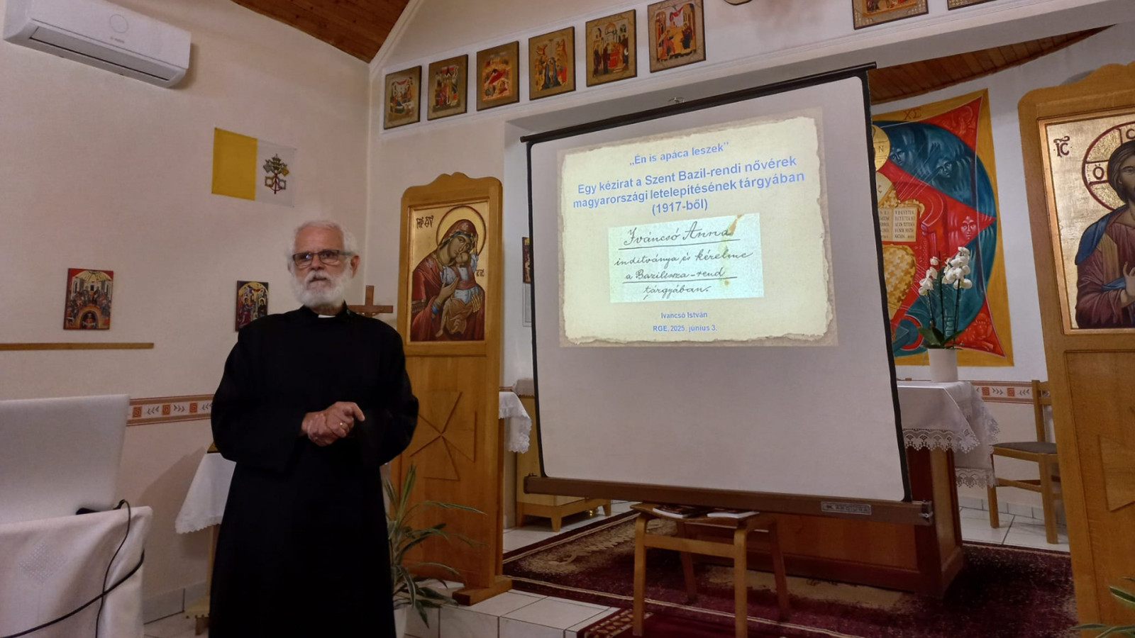 „Ha első kedd, akkor RGE!” – kezdte a házigazda, Ivancsó István atya az előadását, melyet egy kuriózum számba menő levélre alapozott. Ugyanis ezt a levelet 1917-ben Iváncsó Anna írta Miklósy István püspöknek a Szent Bazil Rendi Nővérek magyarországi letelepítésének tárgyában. Iváncsó Anna apáca akart lenni, és kérvényében a következőt vetette fel: