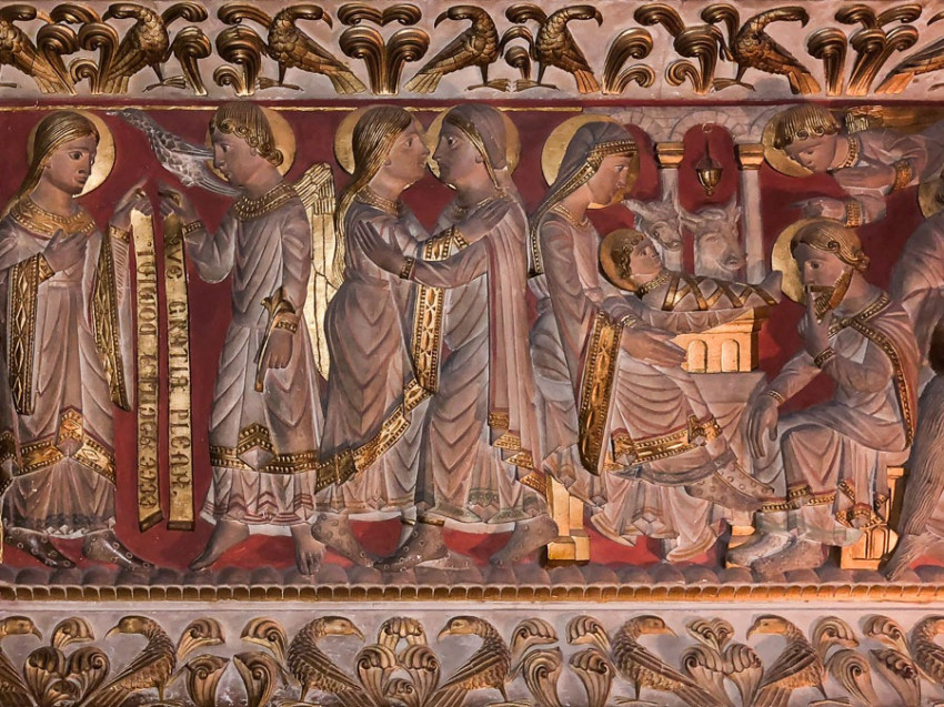 A Lukács evangéliumából (1,39–45) jól ismert történet szerint a várandós Mária felkeresi idősebb rokonát, aki szintén gyermeket vár. Különös a két nő találkozása: az egyikük túl korán, a másik későn lesz anyává. A történet egyúttal négyes találkozóvá is válik, hiszen a még meg nem született Keresztelő János és Jézus is ekkor kerül először egymás közelébe. Lukács szerint ez váratlan érzelmi reakciót váltott ki: Erzsébet méhében felujjong a magzat, Mária pedig szívbéli hálaadó dalra fakad.
