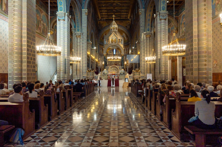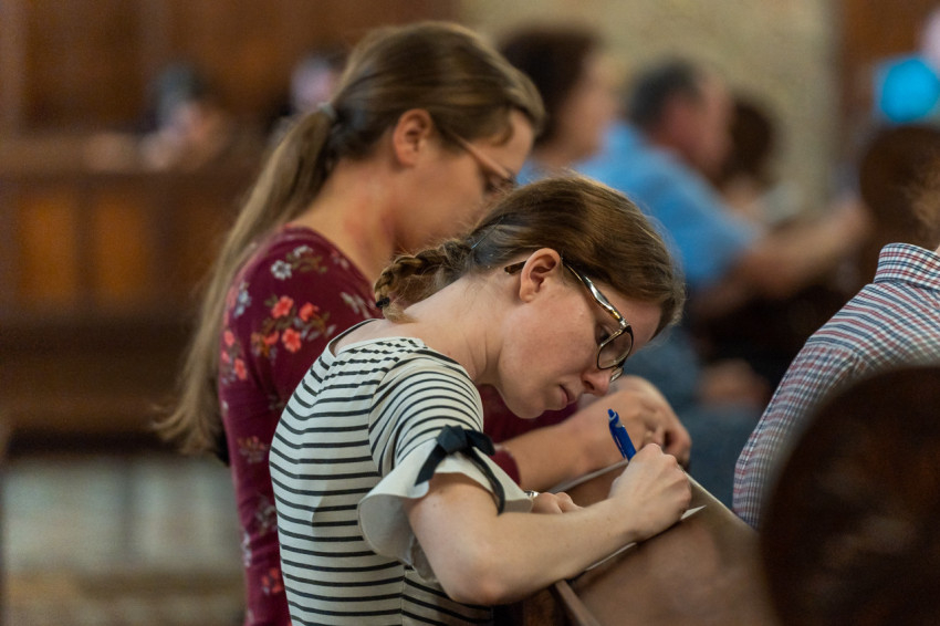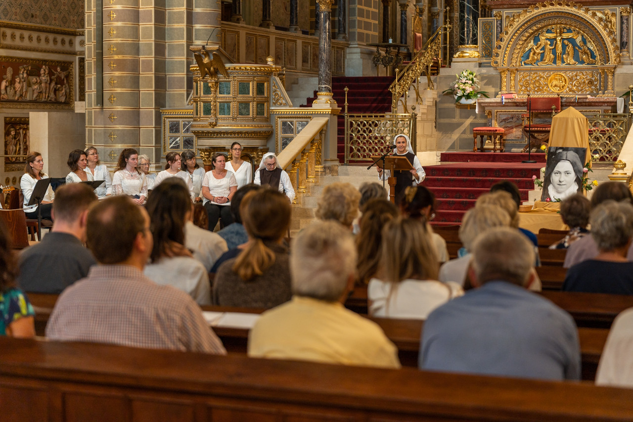 Tavalyhoz hasonlóan idén is megtöltötték a székesegyházat a Pécsről és környékéről, Kaposvárról és Homokkomáromból érkezett felnőttek, fiatalok és gyermekek, akiket a Nyolc Boldogság Közösség pécsi csoportja képviseletében Valter Margit nővér köszöntött Lisieux-i Kis Szent Teréz virágokkal díszített portréja előtt.