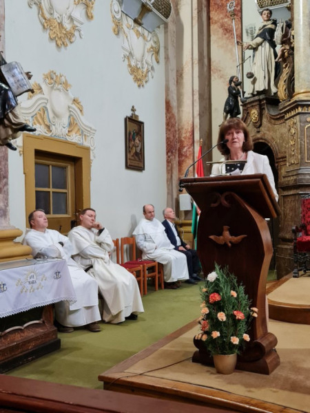 A vasárnapi ünnepi szentmise főcelebránsa és ünnepi szónoka Palatinus Kristóf soproni káplán volt, aki újmisés áldásban is részesítette a híveket. Szentbeszédében kiemelte, hogy a Rózsafüzér Királynője és a Magyarok Nagyasszonya ünnepe egymás melletti napokon az öröm, bizakodás és megújuló remény üzenetét is magukban hordozzák. Hangsúlyozta, hogy Mária oltalma – aki az igazság palástjának és az üdvösség ruhájának viselője – biztosíték számunkra, hogy Isten útját válasszuk, és arról soha le ne térjünk.