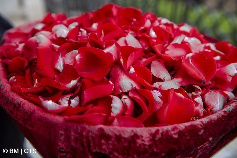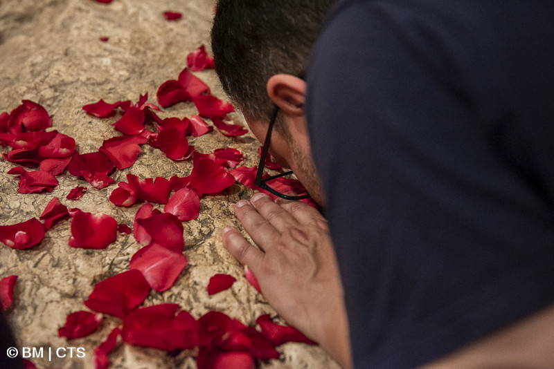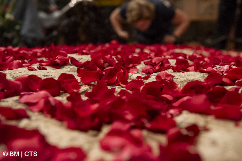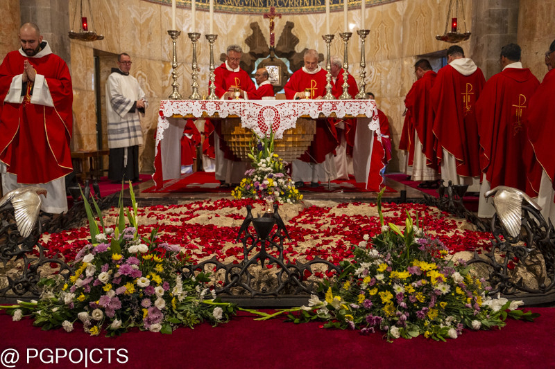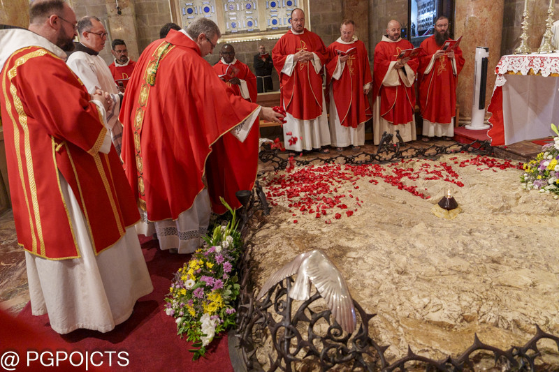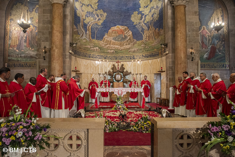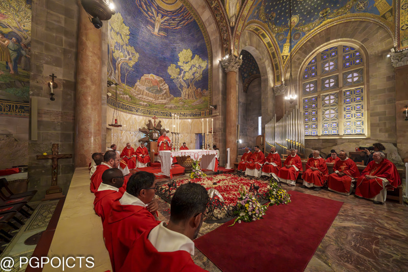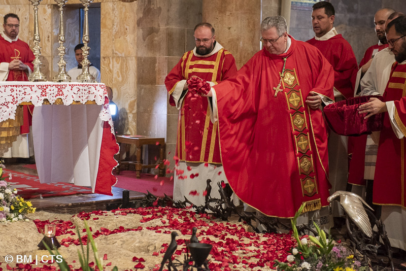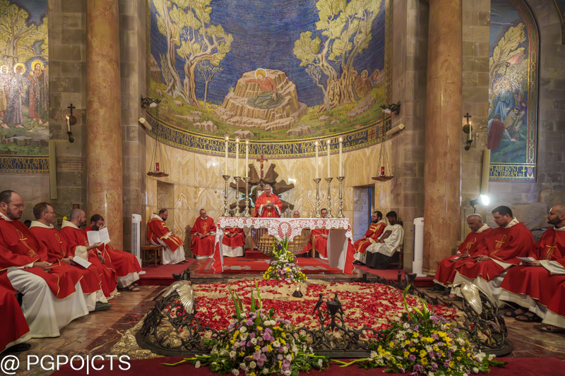 Vércseppekhez hasonlatos vörös rózsaszirmok hullottak a Getszemáni-kert sziklájára, ahol Krisztus vérrel verejtékezett (vö. Lk 22,39–44), miközben a Vexilla Regis himnuszt énekelték a Megváltó Szent Keresztjének tiszteletére. Ezzel kezdődött a szentmise és az Úr Jézus Krisztus Legszentebb Vérének ünnepe a jeruzsálemi Nemzetek templomában (Agónia-bazilika).