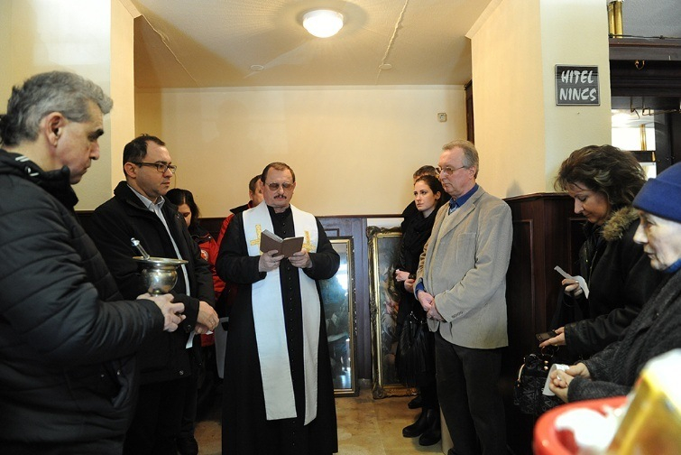 Kispál György a háromkirályok történetének felolvasása és az áldás után szenteltvízzel hintette meg az adakozásból összegyűlt ruhákkal és bútorokkal teli helyiséget.