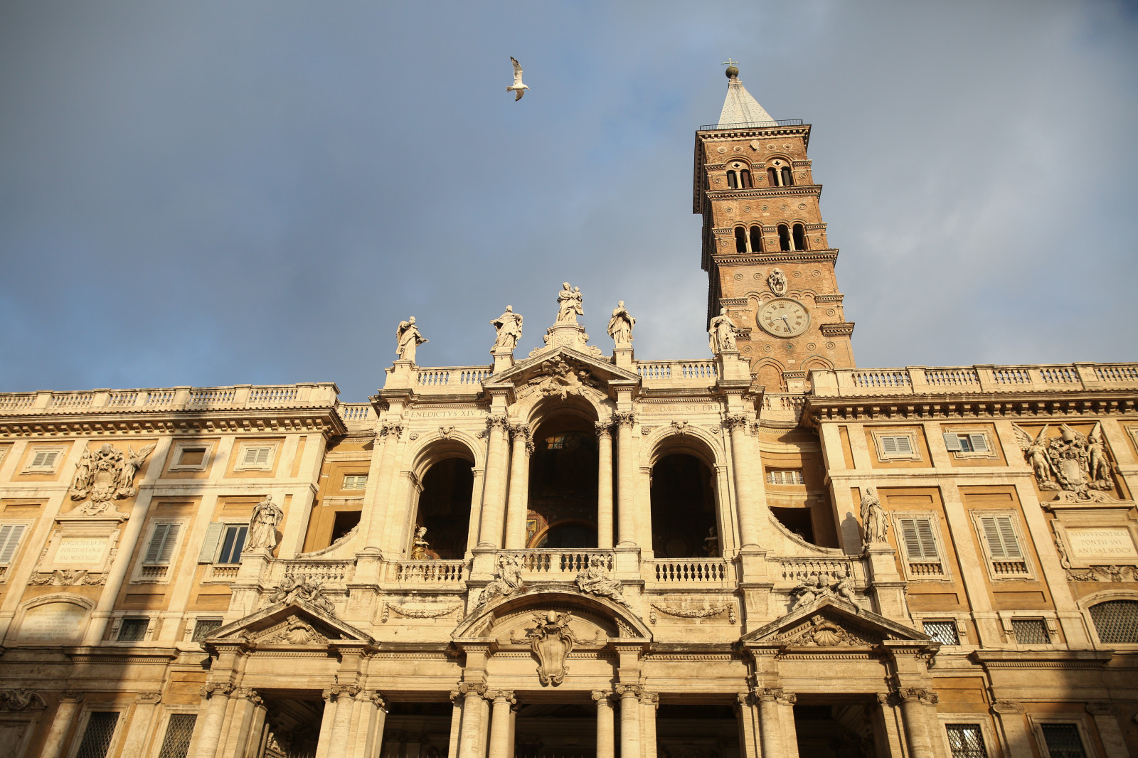 A barokk főhomlokzat és a pápának áldások alkalmával helyet adó lodzsa 1743-ban készült el XIV. Benedek megbízásából, Ferdinando Fuga tervei alapján. A földszinti előcsarnokból négy kapu nyílik a templomtérbe: három a főhajóba, a bal szélső pedig az oldalhajóba. Ez utóbbi a szent kapu, amely a 2000-es nagy jubileumra készült el, ezért Szent II. János Pál címerét viseli. Fölül Mária jelenik meg mint az Isten és az Egyház anyja. A középső nagy mezőkben Máriát és a Feltámadottat szemléljük. Az alsó sorban a templom építésének oka, az Efezusi Zsinat (431), valamint a II. Vatikáni Zsinat (1962–1965) tűnik fel.
