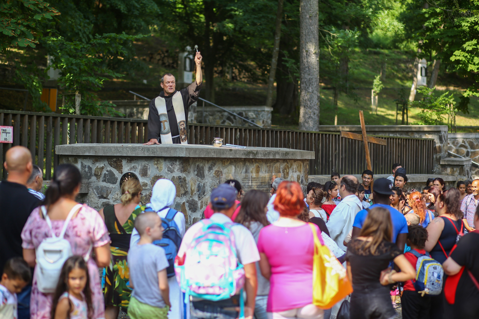 Orosz Lóránt OFM kegyhelyigazgató a bejáratnál fogadta a zarándokcsoportokat, együtt imádkozott velük és megáldotta őket. A gyülekezés alatt a szendrőládi dicsőítő zenekar teli torokból énekelt a kültéri oltárnál: „Nagyon szeretlek téged, Jézusom!” Hangjuk összevegyült az érkező csoportok bazilikában tett Mária-köszöntésével.