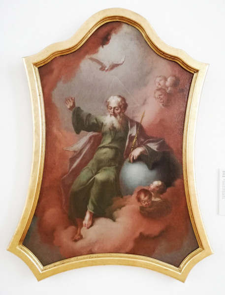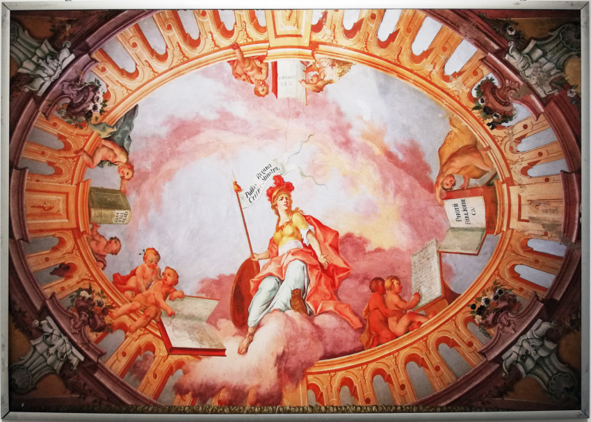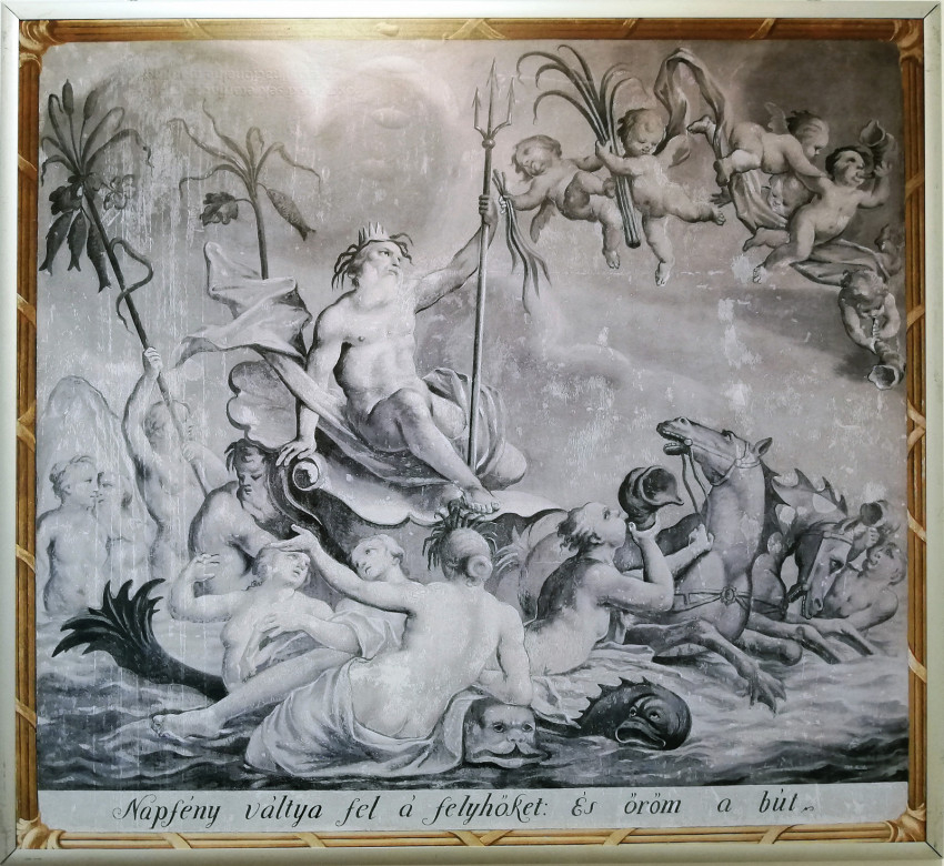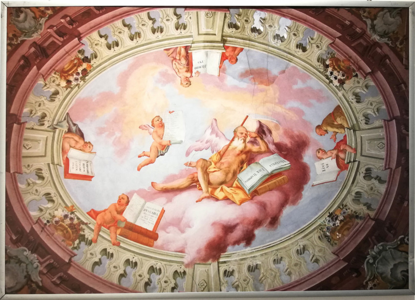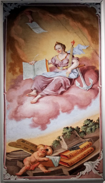 A jó néhány kép közül talán a Teológia az egyik legérdekesebb. Kissé naivnak hatnak ugyan ezek a falképek, de kétségtelenül bájosak. A főalakokat puttók veszik körül, a kis meztelen gyerekek néha a levegőben röpdösnek, máskor meg elmélyülten olvassák az evangéliumot, mint például az imént említett Teológia című képen is.