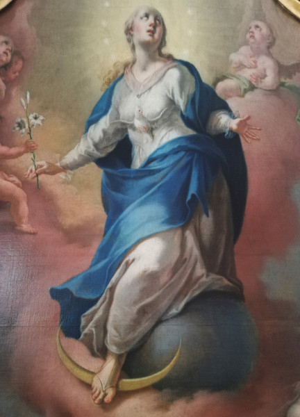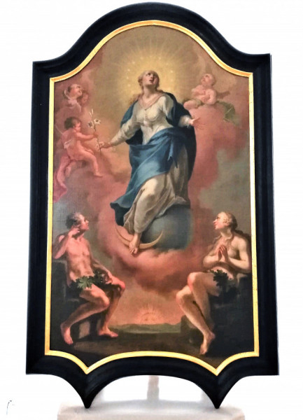 A kiállítás talán legszebb alkotása az 1768-ból származó, Immaculata Ádámmal és Évával című nagy méretű festmény a dunaföldvári Szent Anna-templomból. A kép főterében a Szeplőtelen Szűzanya látható fehér ruhában, feje körül tizenkét csillaggal, szíve magasságában a Szentlélekkel, lába alatt a holdsarlóval és a világmindenséget jelképező kék gömbbel. Éppen egy szál liliomot vesz át. Remek kompozíció, komoly ábrázolás, a kiállítás kiemelkedő darabja.