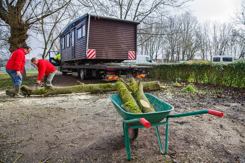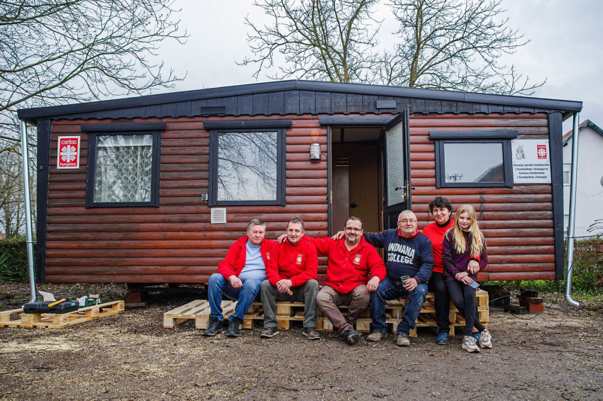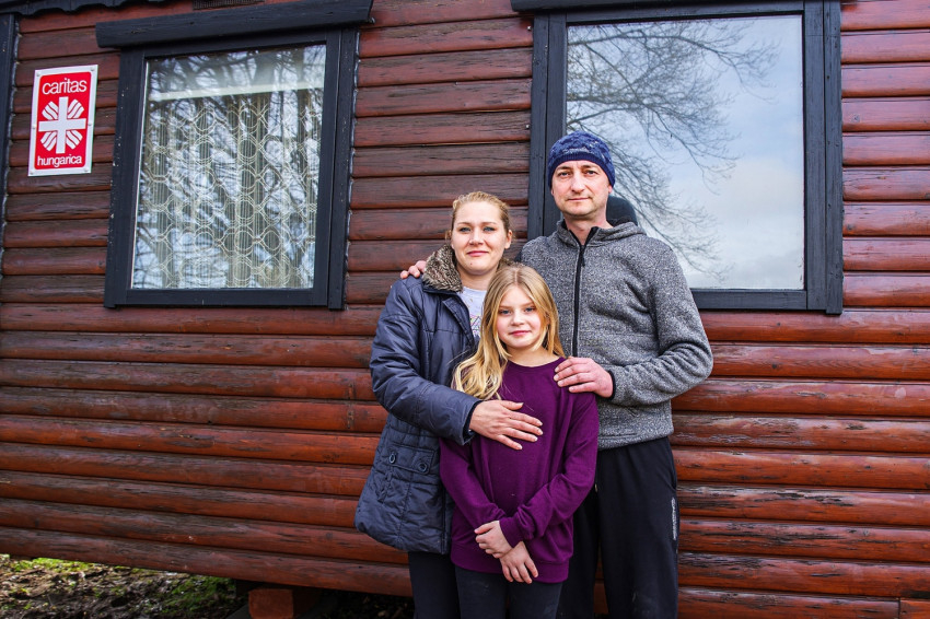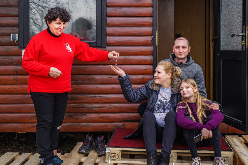 A mobilház biztonságos elhelyezéséhez a karitász munkatársai fát vágtak, terepet rendeztek, lépcsőt építettek, valamint stabilan alátámasztották az ideiglenes lakóházat. A többórás munkába a szomszédok is besegítettek, a fiatal, kétgyermekes házaspár pedig boldogan vette át a mobilház kulcsát, és foglalta el új lakhelyét.