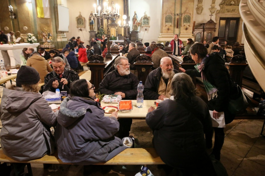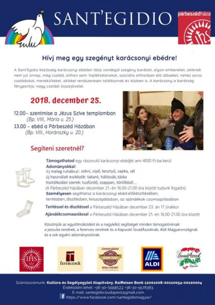 A Sant’Egidio közösség 1982-ben szervezte az első karácsonyi ebédet a római Santa Maria in Trastevere-bazilikában, akkor húsz ember vett részt az ünnepségen. A szegényekkel együtt elköltött karácsonyi ebéd azóta hagyomány lett, idén több mint hétszáz településen terítenek asztalt az ünnepre. Magyarországon öt városban, Budapesten, Pécsen, Győrben, Szegeden és Monoron hívják ebédre szegény barátaikat a közösség tagjai.