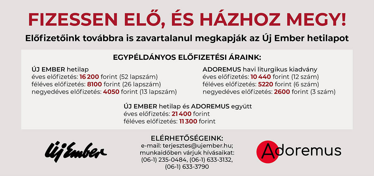 Aki teheti, aki tudja, fizessen elő az Új Ember hetilapra és az Adoremus liturgikus kiadványunkra. A járvány szűnni fog, előbb-utóbb visszaáll majd a normális élet. Nem lesz olyan, mint egy hónapja volt. Akkor bizonyára élni fog bennünk a szolidaritásnak, az egymás iránti felelősségérzetünknek az emléke, talán sokakban meg is marad. Fontos lesz, hiszen esendőnek akkor is esendőek leszünk. Tegyünk együtt az Új Ember és az Adoremus megmaradásáért! Köszönjük!