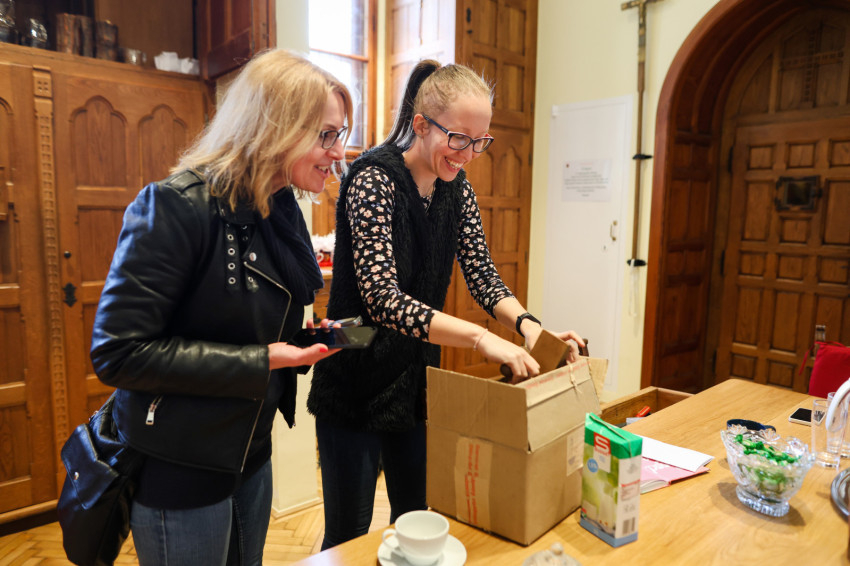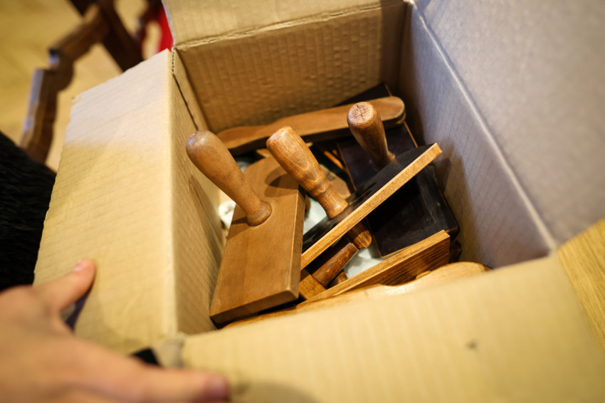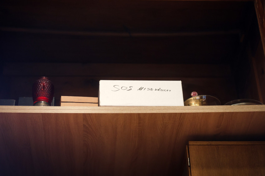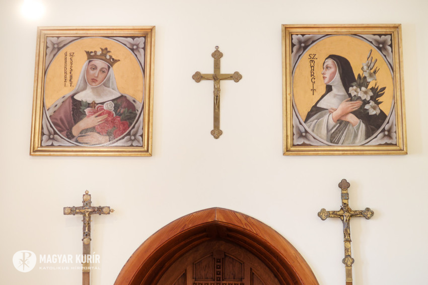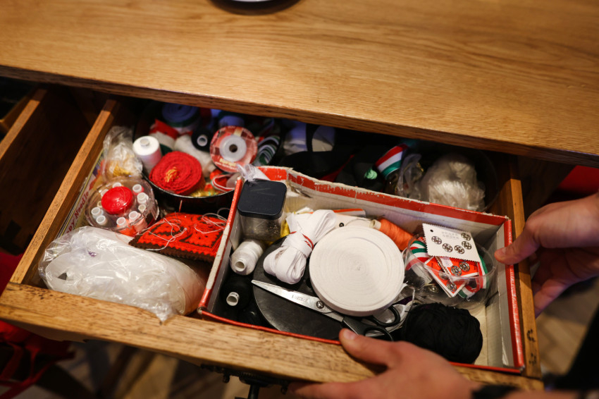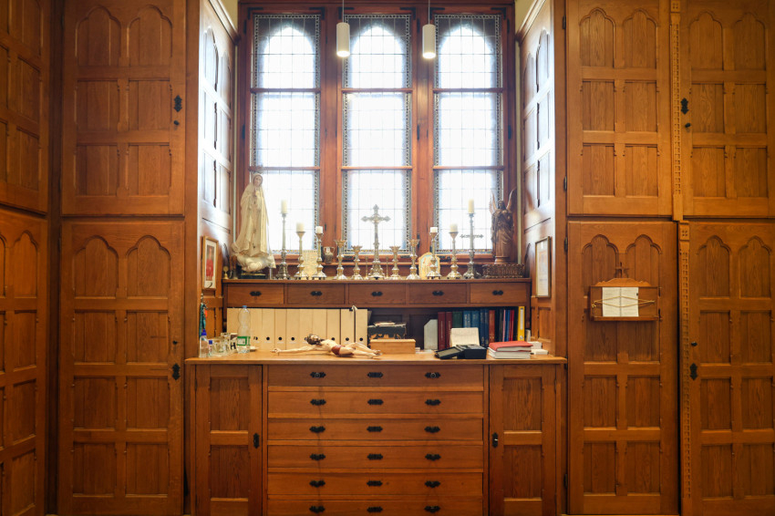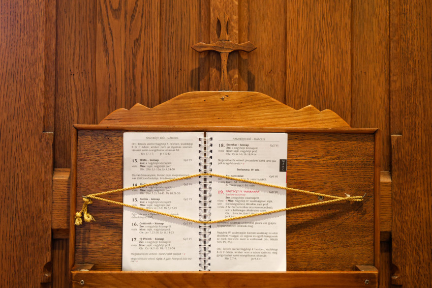 Adrienn kitárja az egyik szépen felújított szekrény ajtaját, amelyben a miseruhákat és a stólákat őrzik. „Tudjuk, melyik kazula Laci atyáé, melyik Bálint atyáé. Vannak vendég papoknak szánt ruhák is. Ezeket is mi tisztítjuk, de nem kell hazavinnünk őket, mert van itt mosógépünk és vasalónk” – magyarázza Adrienn. „Varrni a legnehezebb – teszi hozzá Zsolt, de Adrienn nevet, mert mint mondja, „Zsolti nagyon szépen tud varrni”. Kinyitják az asztal egyik fiókját: itt tartják a szépen elrendezett varrókészletet, amit még nagymamáink is megirigyelhettek volna. Mellette, a műszaki fiókban, ugyanilyen rendben sorakoznak a különböző szerszámok. Az asztal túloldalán, a talált tárgyak fiókjában még egy 1820-as kiadású latin nyelvű könyv is várja a tulajdonosát. Egy másikban pedig az előre elkészített imacédulák sorakoznak.