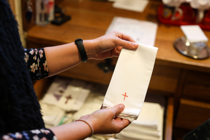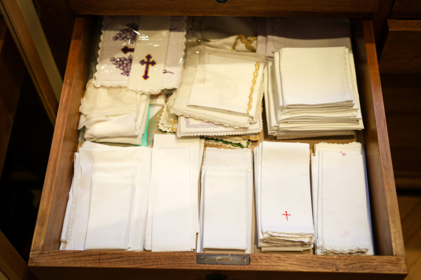 „Minden szentmiséhez tiszta kehelykendőt készítünk elő. Krisztus vérét törlik vele, így mindig hófehérnek és makulátlanul tisztának kell lennie” – mondja Zsolt, s közben kinyit egy másik fiókot.