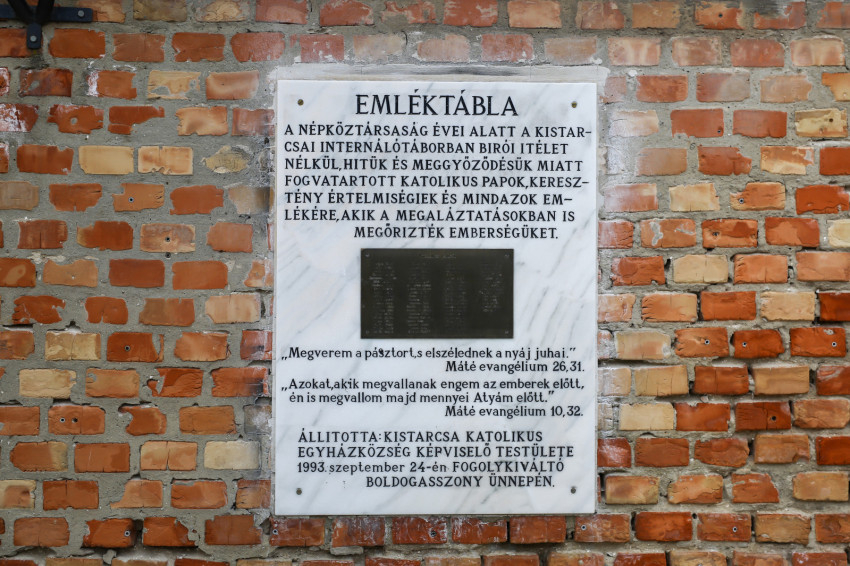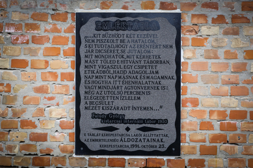 A tábor emlékfala előtt állok. A Csigaházból, Kistarcsa művelődési központjából kóruspróba hangjai szűrődnek ki. Az első tábla Faludy György Marcus Aureliust a táborból 1950-ben megszólító, az ő bölcsességét és sztoikus nyugalmát óhajtó soraival emlékezik; a második Meszlényi Zoltán, a mártír püspök szikár életadataival, a harmadik pedig az itt raboskodott katolikus papok névsorával.