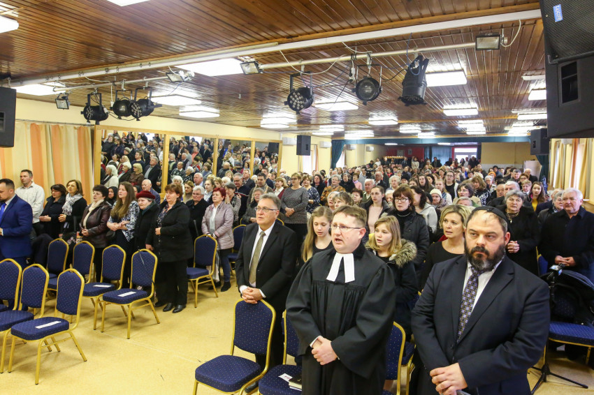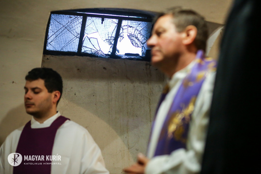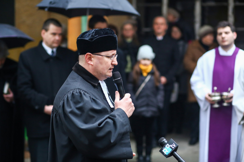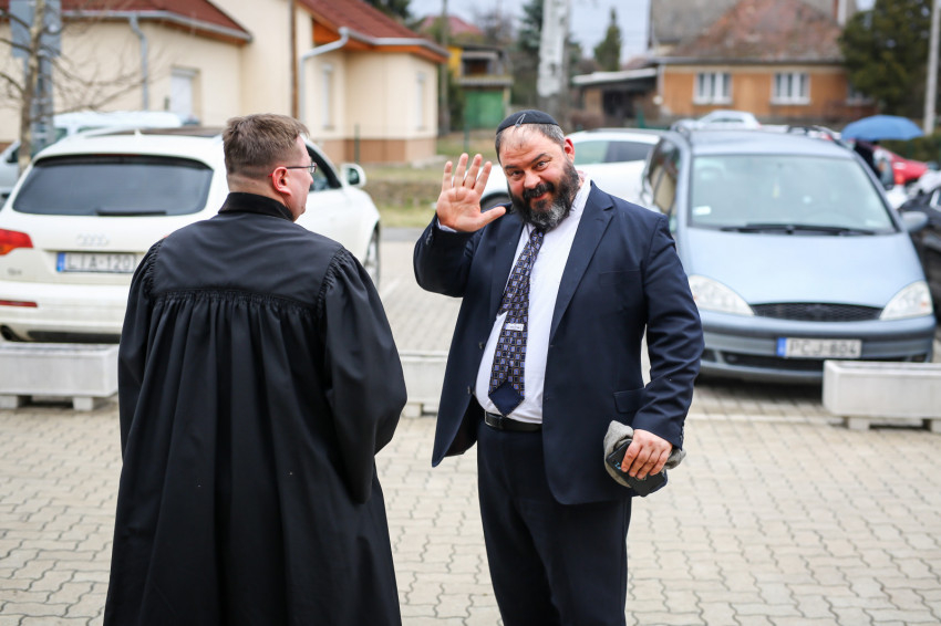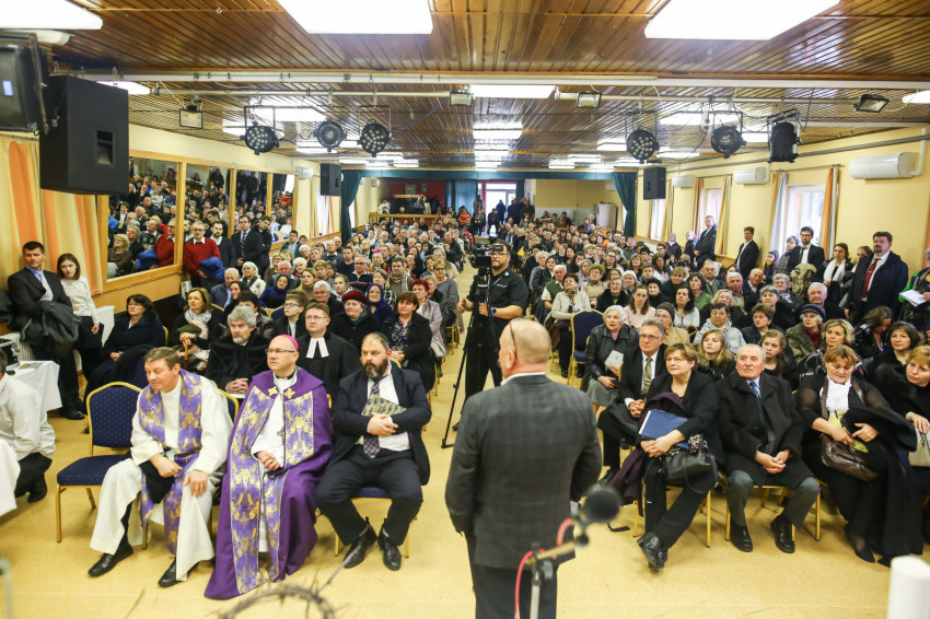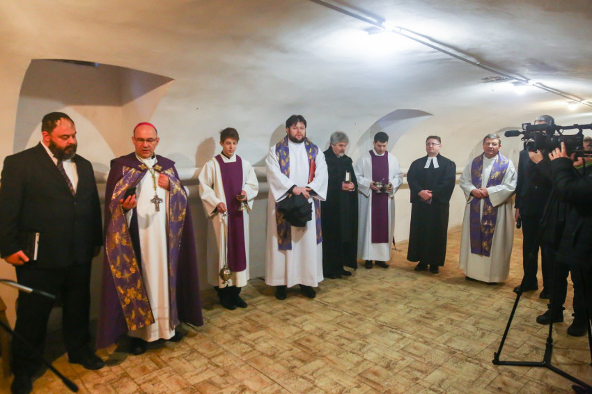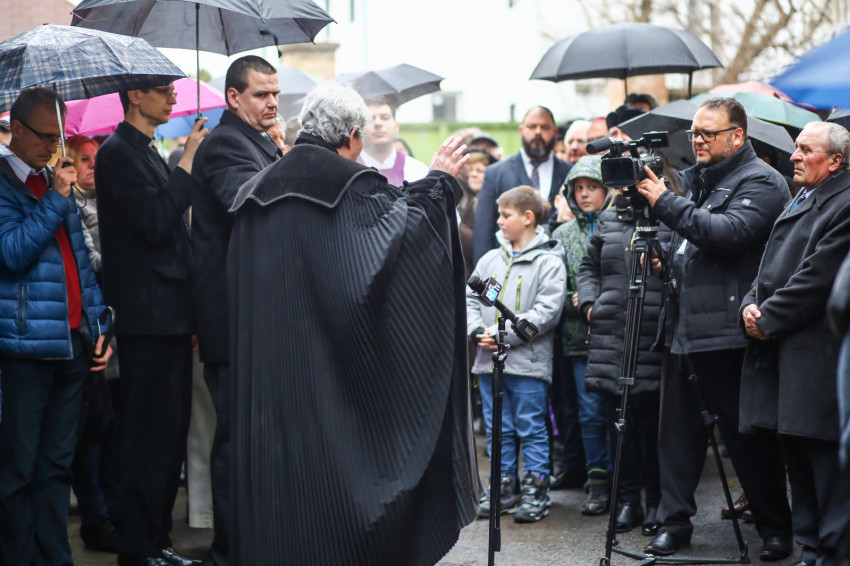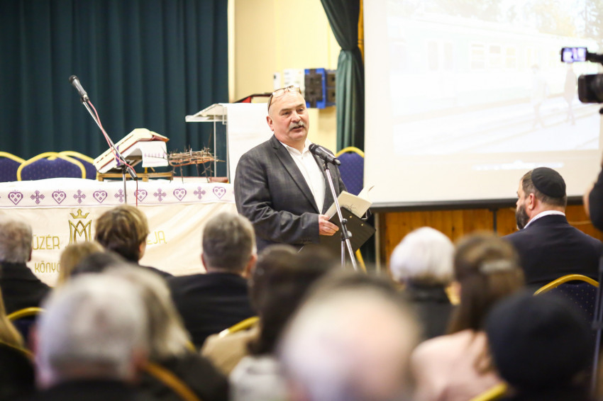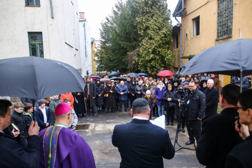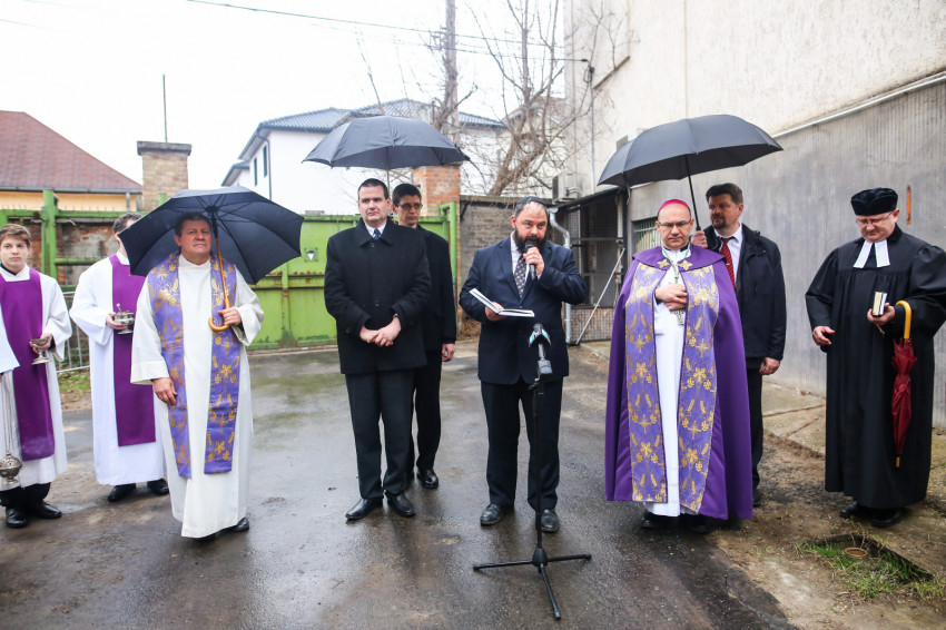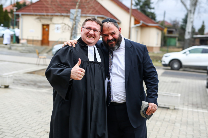 A mise után Görbe József plébános üdvözli az ökumenikus-vallásközi megemlékezés és engesztelő ima résztvevőit, köztük Radnóti Zoltán főrabbit, Riskó János református és Eszlényi Ákos evangélikus lelkészt.