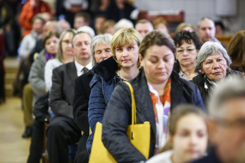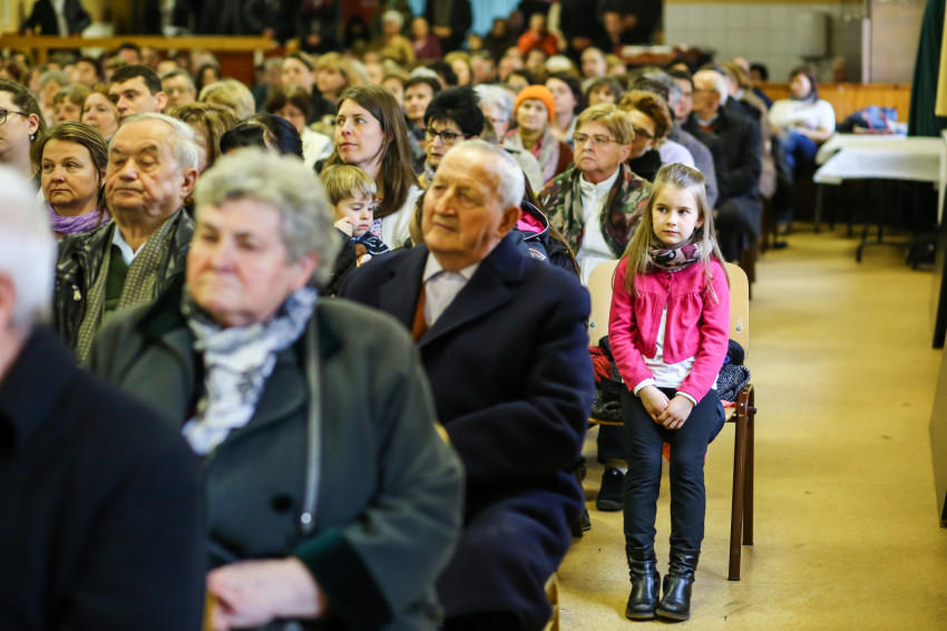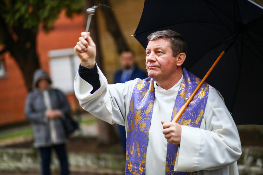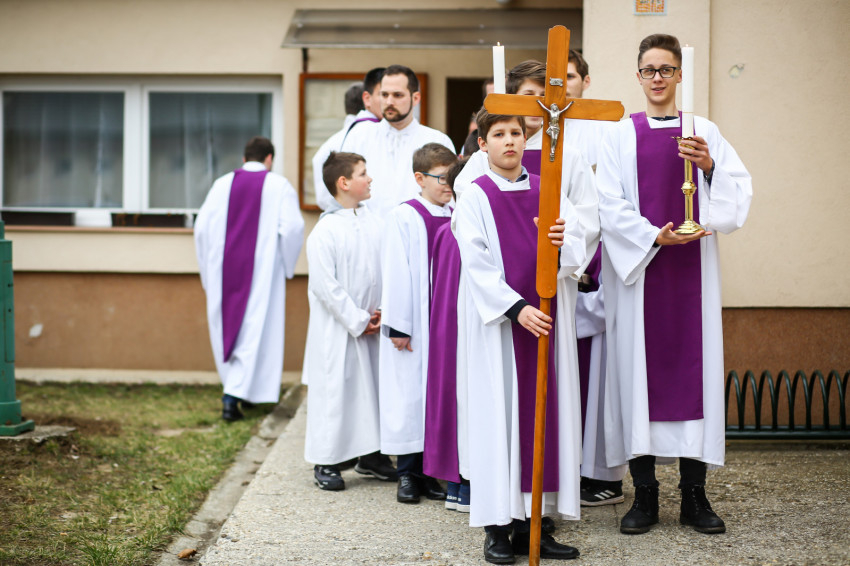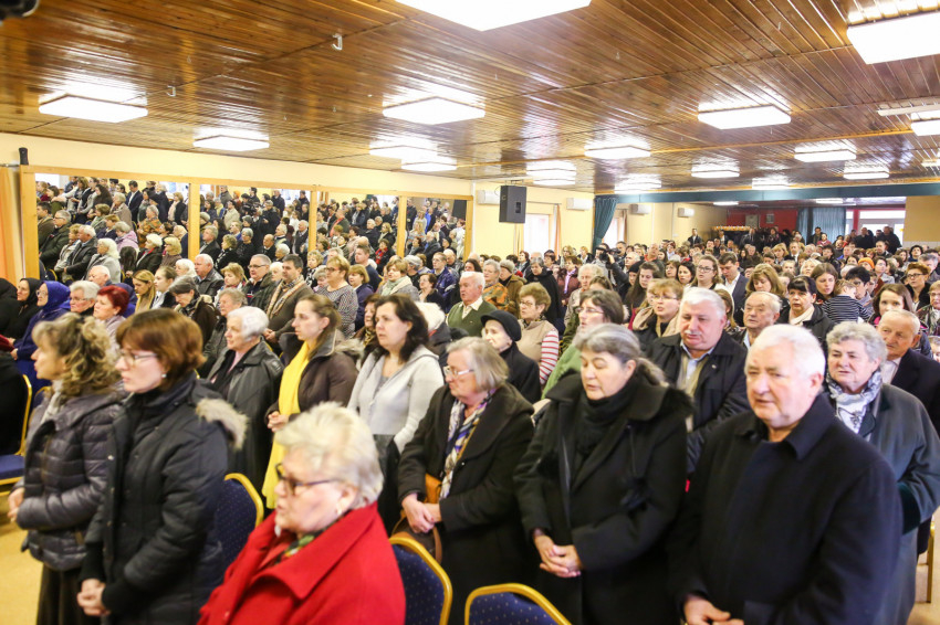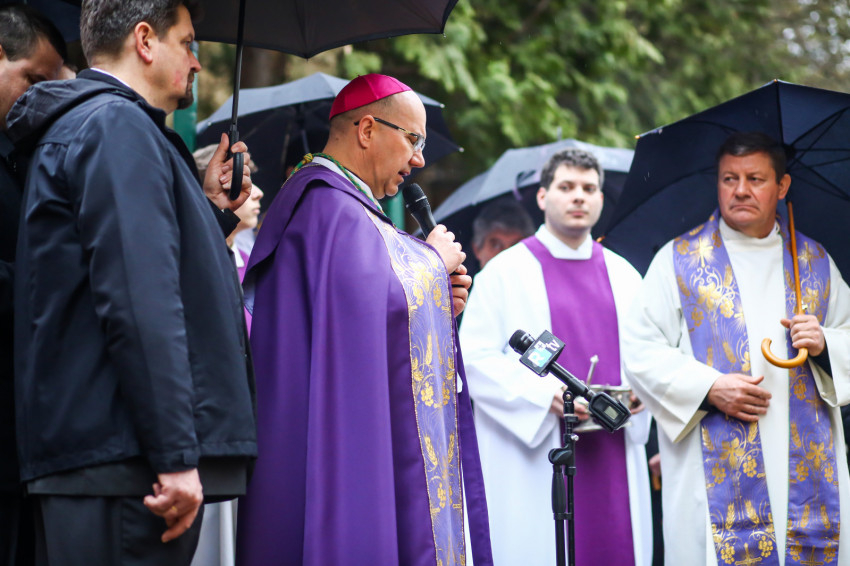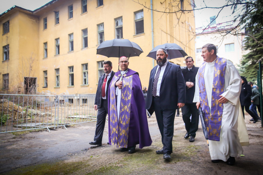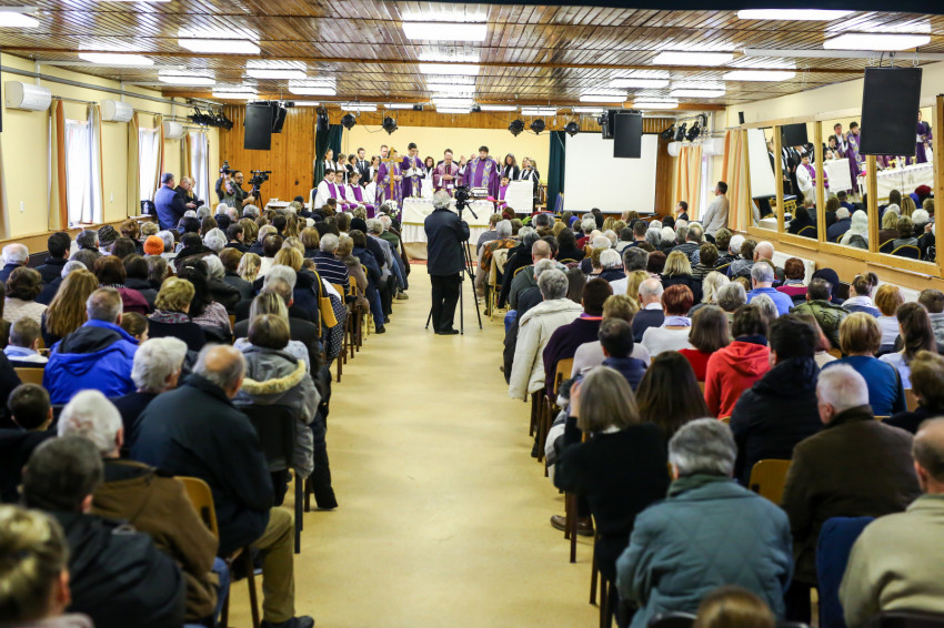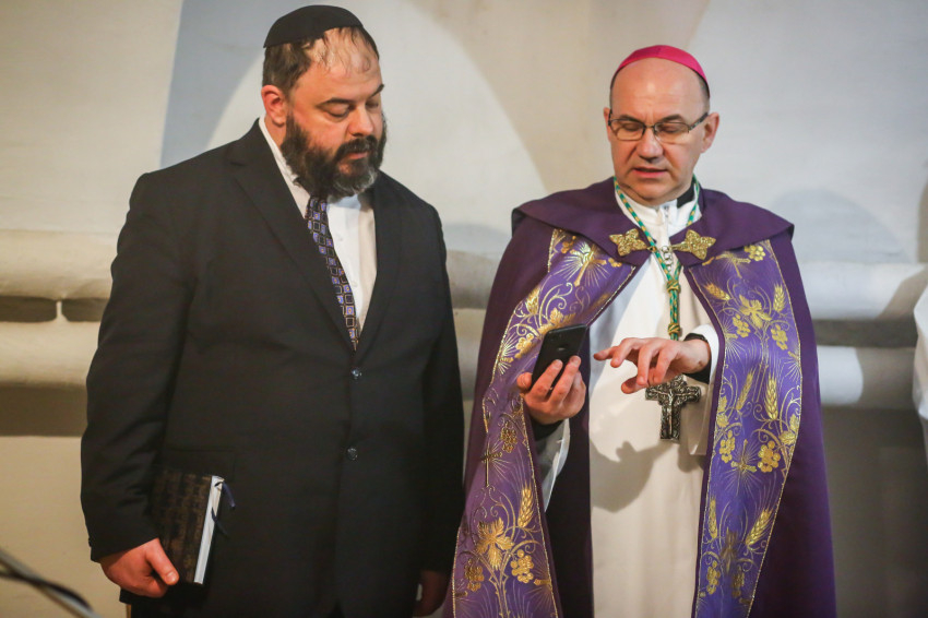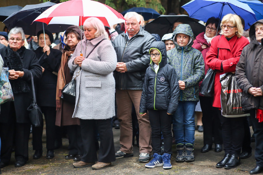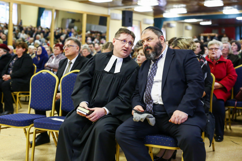 A mise után Görbe József plébános üdvözli az ökumenikus-vallásközi megemlékezés és engesztelő ima résztvevőit, köztük Radnóti Zoltán főrabbit, Riskó János református és Eszlényi Ákos evangélikus lelkészt.